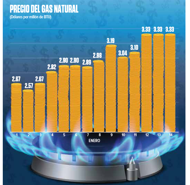 Según los datos históricos de Investing, el pasado 2 de enero, es decir, al arranque de este 2024, el precio de referencia de la molécula registró un costo de 2.67 dólares por millón de BTU (unidad térmica británica), sin embargo, al 14 de enero el costo alcanzó los 3.33 dólares por millón de BTU.