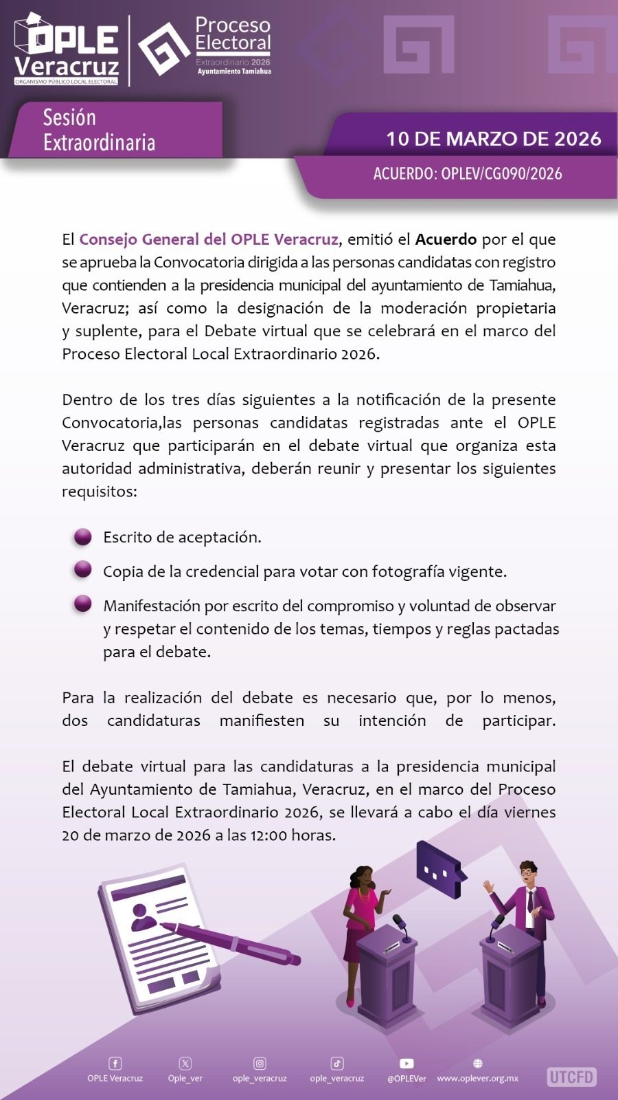 Xalapa, Ver.- En sesión extraordinaria, el Consejo General aprobó la convocatoria dirigida a las personas candidatas con registro que contienden a la presidencia municipal del ayuntamiento de Tamiahua; así como la designación de la moderación propietaria y suplente, para el debate virtual que se celebrará en el marco del Proceso Electoral Local Extraordinario 2026.