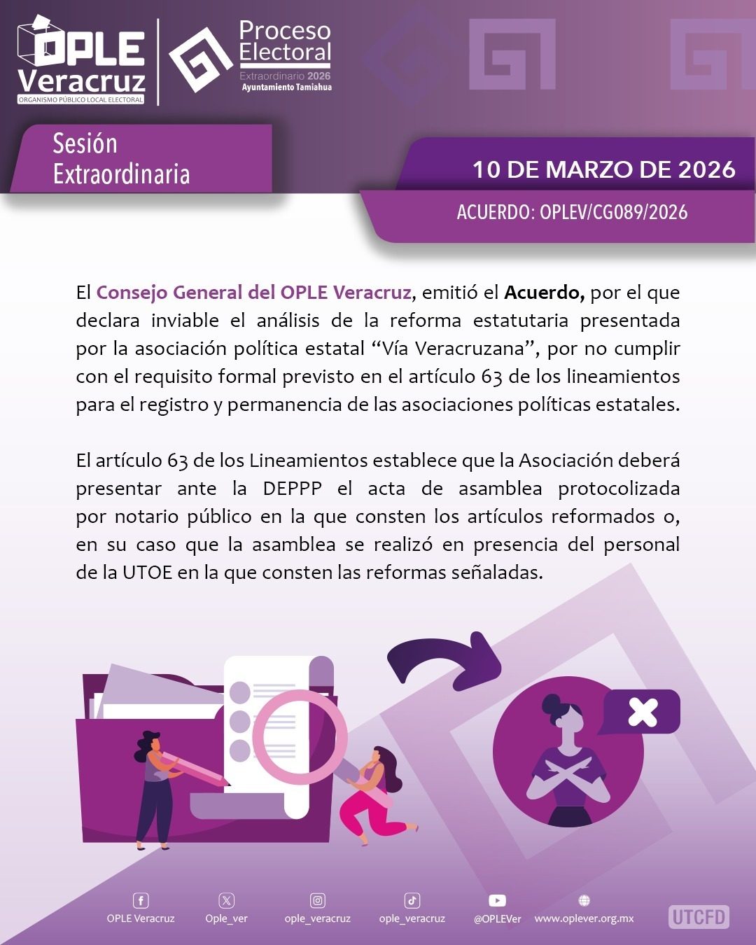 En otro punto del orden del día, se declaró inviable el análisis de la reforma estatutaria presentada por la Asociación Política Estatal “Vía Veracruzana” por no cumplir con el requisito formal previsto en el artículo 63 de los Lineamientos para el registro y permanencia de las Asociaciones Políticas Estatales.