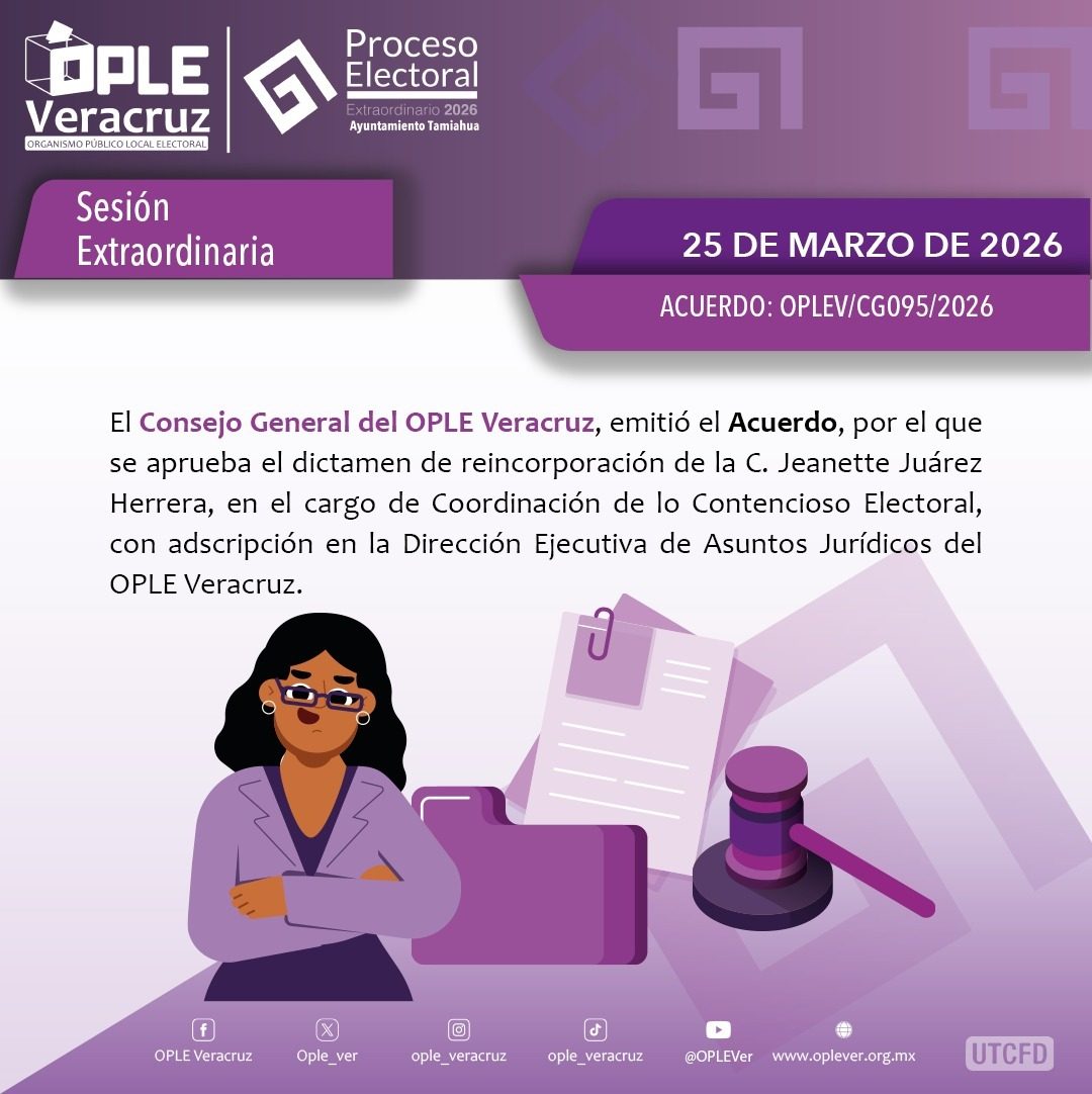 Durante la sesión extraordinaria, se aprobó el dictamen de reincorporación de la C. Jeanette Juárez Herrera, en el cargo de Coordinación de lo Contencioso Electoral, con adscripción en la Dirección Ejecutiva de Asuntos Jurídicos del OPLE Veracruz.