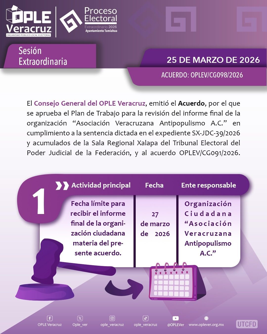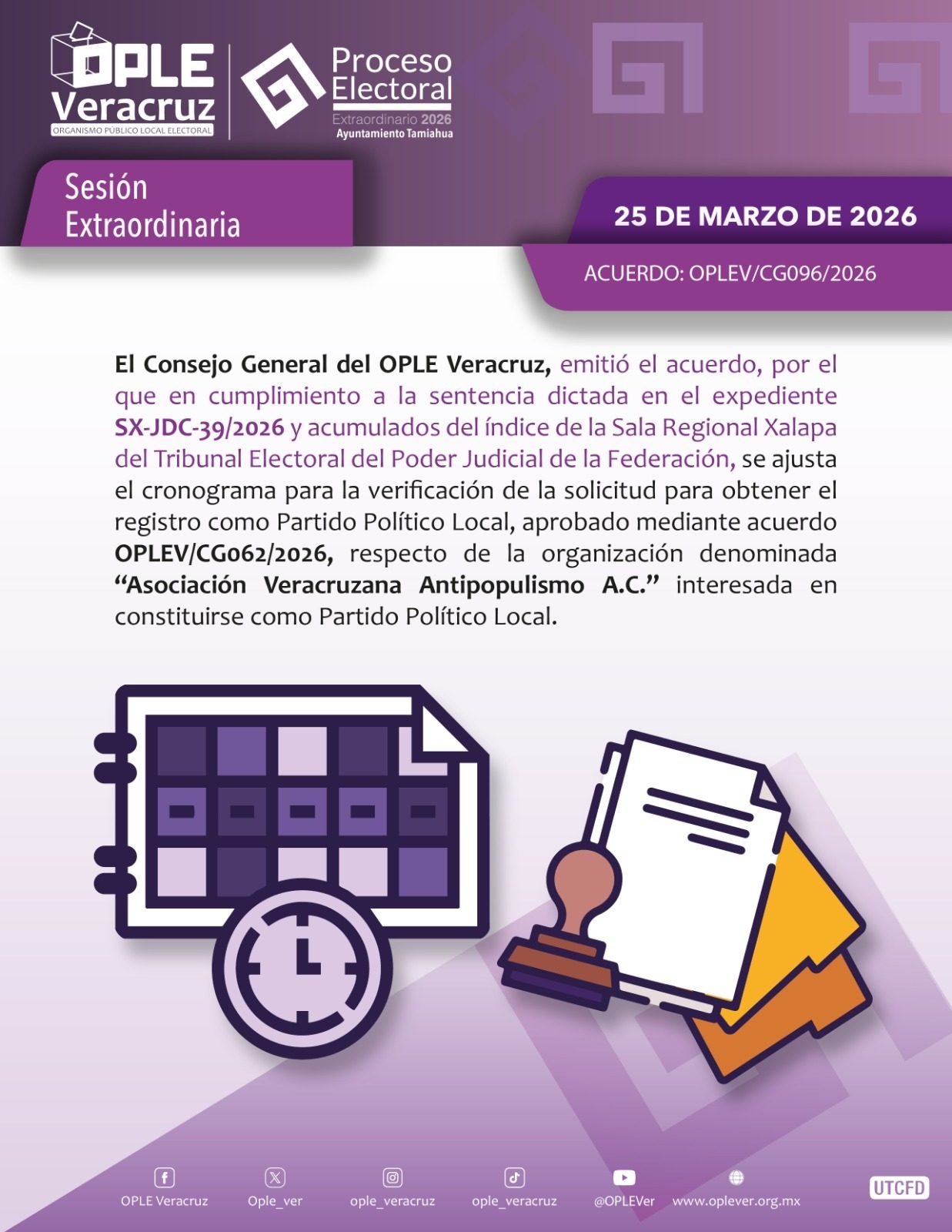 Xalapa, Ver.- En el marco del cumplimiento de la sentencia SX-JDC-39/2026 emitida por la Sala Regional Xalapa del Tribunal Electoral del Poder Judicial de la Federación, en la que autorizó a la “Asociación Veracruzana Antipopulismo A.C.” celebrar su asamblea local constitutiva en fechas fuera del calendario programado, en sesión extraordinaria, el Consejo General del Organismo Público Local Electoral del Estado de Veracruz aprobó el ajuste del cronograma para la verificación de la solicitud para obtener el registro como Partido Político Local (PPL).