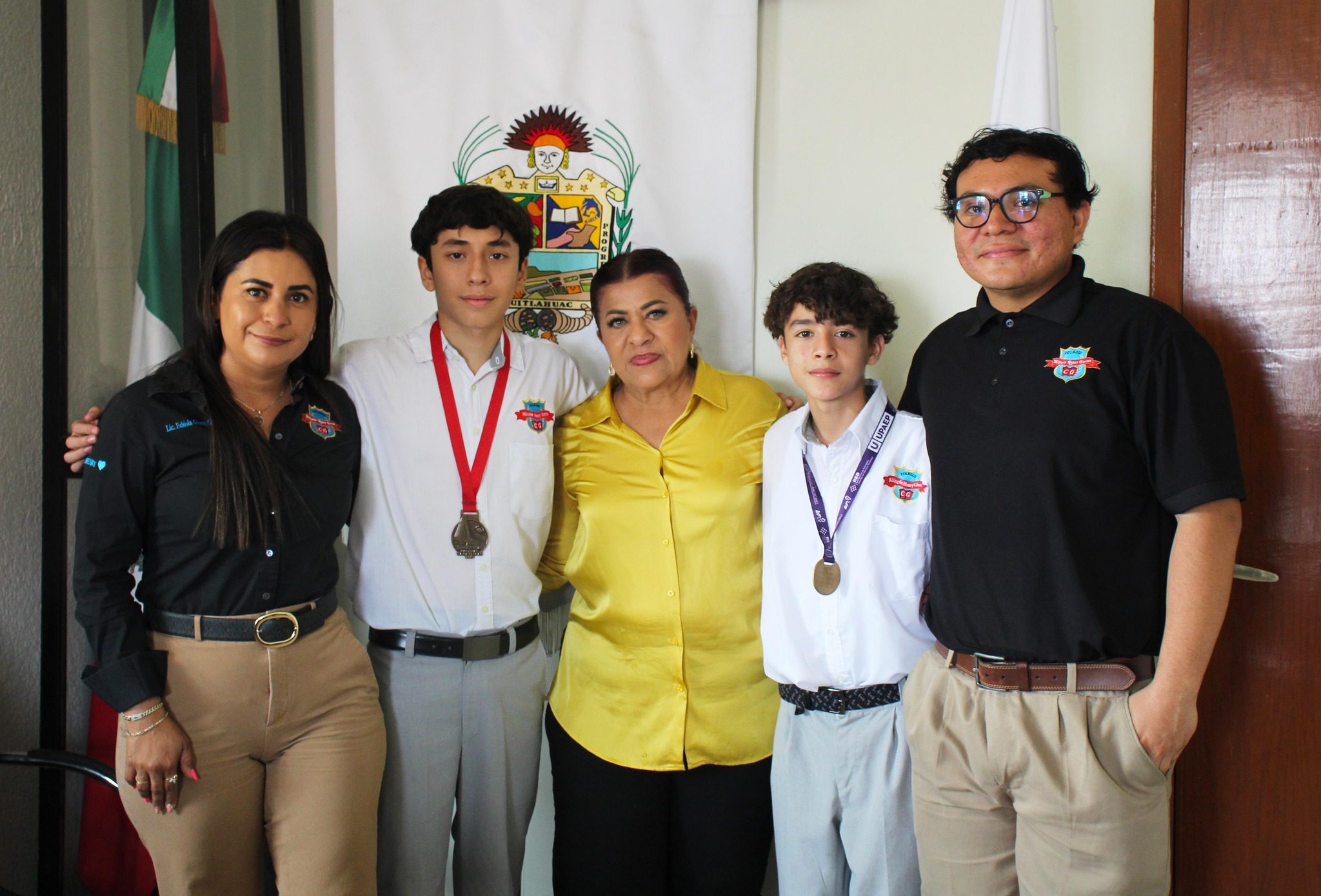 Cuitláhuac, Ver.- La alcaldesa de Cuitláhuac, Angélica Peña Martínez, recibió a los alumnos Horacio Lara Rodríguez y José Gilberto Serna García, acompañados por directivos y docentes del Colegio Bilingüe Henry Giroux.