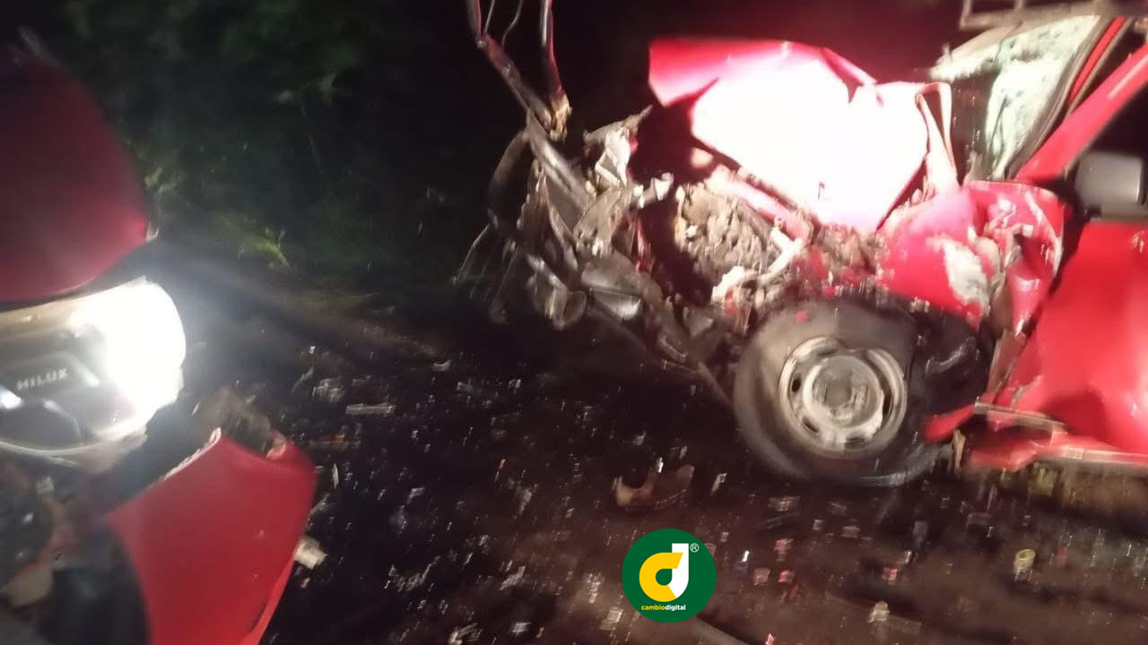 Padre e hijo, ocupantes de una camioneta roja Nissan Pick Up, fallecieron luego de que una camioneta Hilux del mismo color invadiera los carriles de circulación, al intentar rebasar.