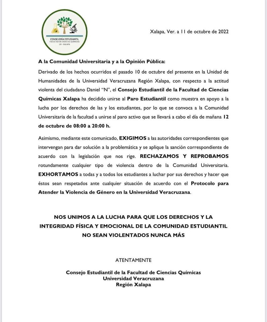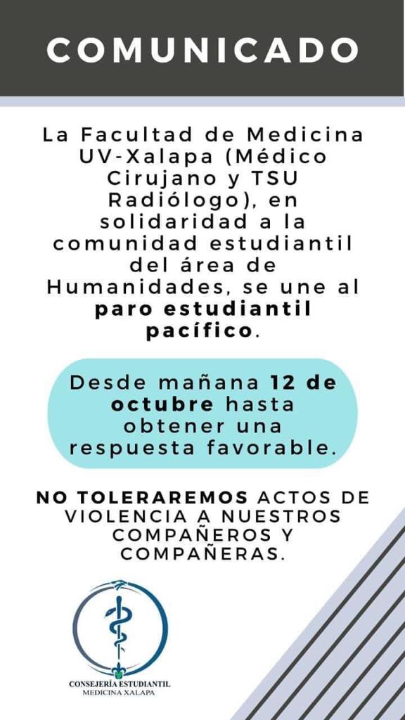 Entre los planteles que se suman al paro en Xalapa se encuentran las facultades de Psicología, Medicina, Bioanálisis, Derecho, Ingeniería mecánica eléctrica, Enfermería, Ciencias Químicas, Biología, Estadística, Ingeniería Civil, Historia, Estadística, Contaduría, y Ciencias Administrativas y sociales.