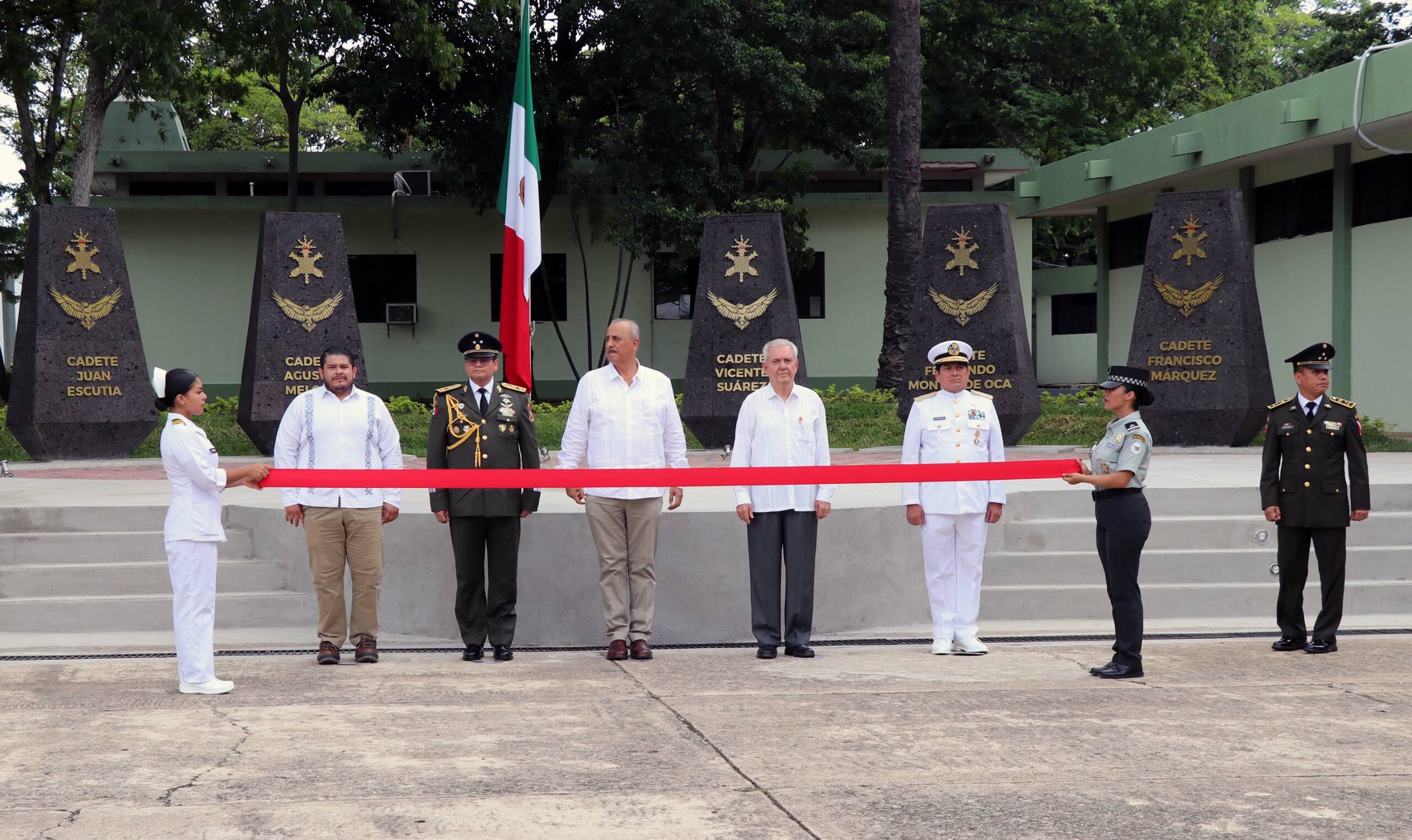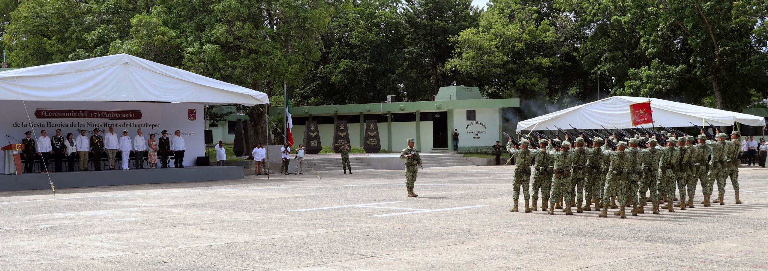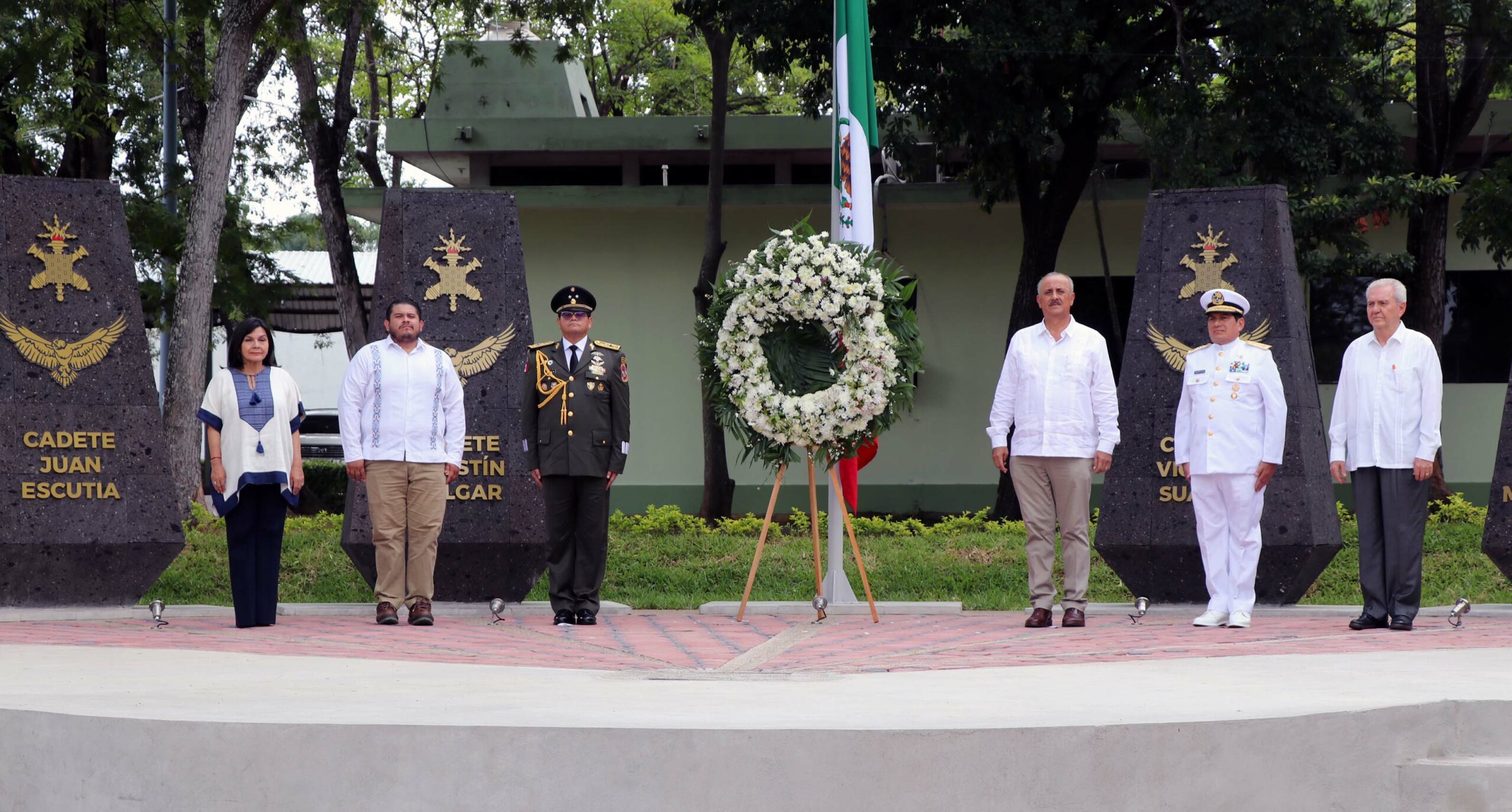 En la explanada el trigésimo séptimo Batallón de Infantería, los funcionarios inauguraron un monumento en honor a los cadetes del Heroico Colegio Militar quienes el 13 de septiembre de 1847 ofrendaron sus vidas en defensa de la soberanía nacional, ante el cual depositaron ofrenda floral y montaron guardia de honor.