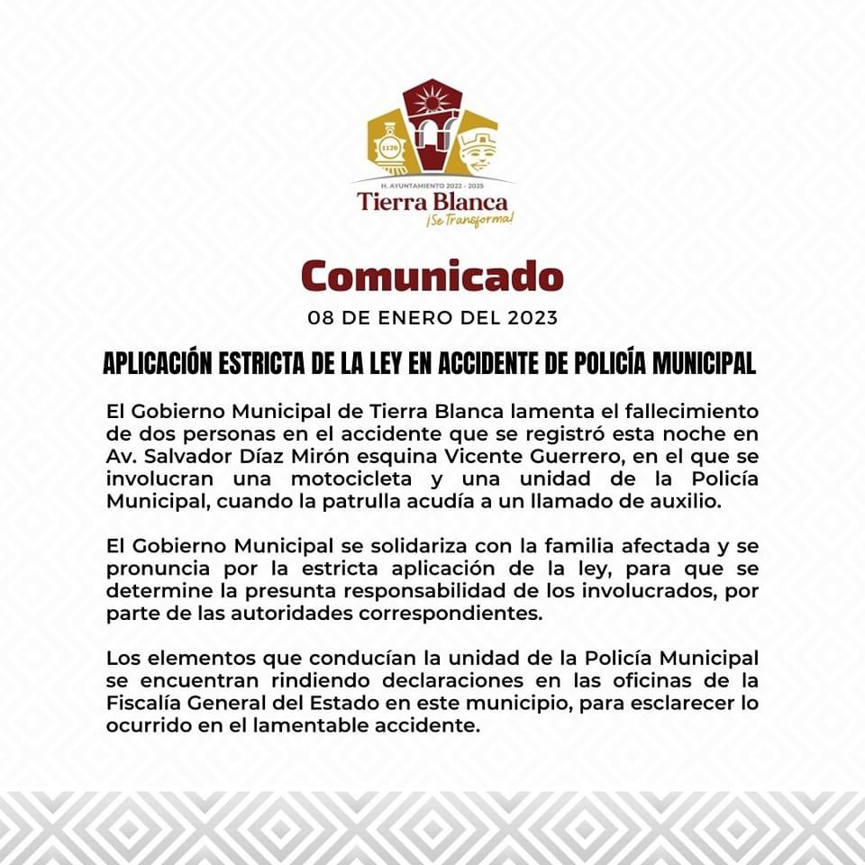En comunicado el ayuntamiento de Tierra Blanca lamentó lo ocurrido, señaló que los elementos acudían a un llamado de auxilio y que los mismos ya estaban rindiendo declaración de los hechos.