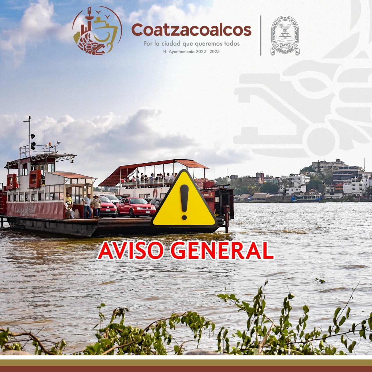 El Ayuntamiento de Coatzacoalcos notifica al público en general que el día de hoy viernes 13 de enero, derivado de las condiciones climatológicas ocasionadas por el Frente Frío 23, se encuentra cerrado el paso de lanchas y transbordadores entre Coatzacoalcos y Villa Allende.
