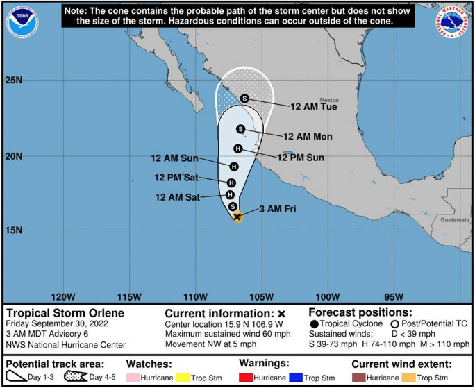 La todavía tormenta tropical Orlene comenzó a girar hacia el noroeste para enfilarse hacia Sinaloa y Nayarit.