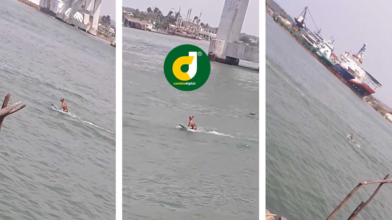 El animal, una perra criolla, monta una tabla de surf acompañado de un joven de nombre Luis Silvestre Osorio, velador de una palapa de los restaurantes de la playa Villa del Mar, en el puerto de Veracruz.
