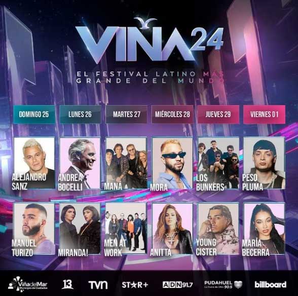 Cantantes como el tenor Andrea Bocelli, Alejandro Sanz, Manuel Turizo, Anitta y el grupo mexicano Maná, también formarán parte de esta edición, se presentarán en este orden: