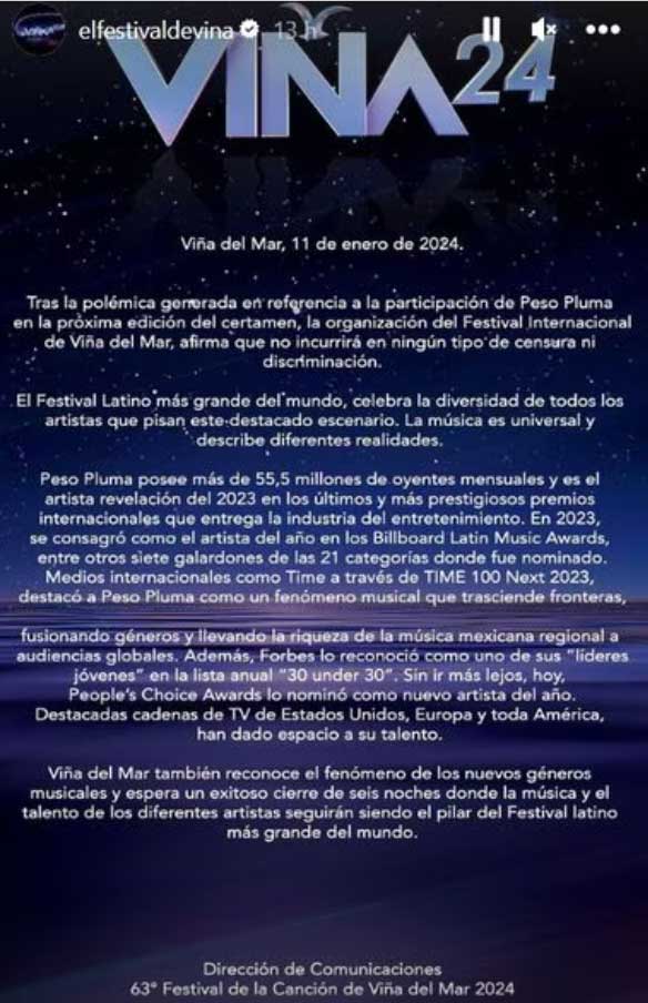 Sin embargo, la producción del festival emitió un comunicado en el que confirma la presentación de Peso Pluma tal como estaba programada. “Tras la polémica generada en referencia a la participación de Peso Pluma en la próxima edición del certamen, la organización del Festival Internacional de Viña del Mar, afirma que no incurrirá en ningún tipo de censura ni discriminación. El Festival Latino más grande del mundo celebra la diversidad de todos los artistas que pisan este destacado escenario. La música es universal y describe diferentes realidades”, dicen.
