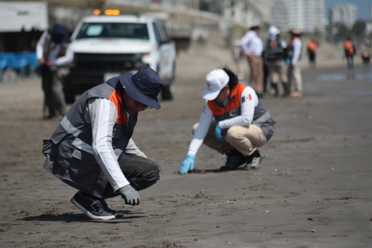 Precisó que se trata de trazas de hidrocarburo presentes en cantidades reducidas, sin acumulaciones mayores, las cuales son retiradas mediante un trabajo minucioso. Las labores se concentran en la zona de rompiente, donde el oleaje deposita los residuos, mismos que son recolectados de forma manual tras un primer barrido municipal.