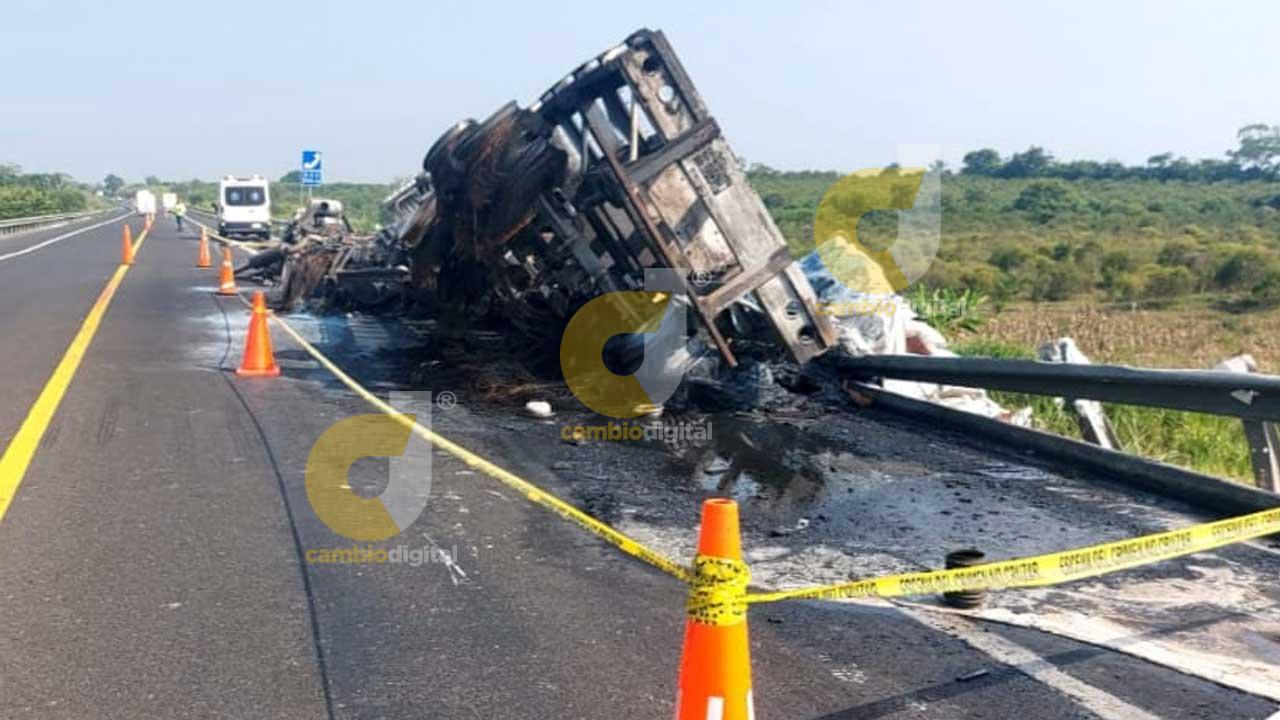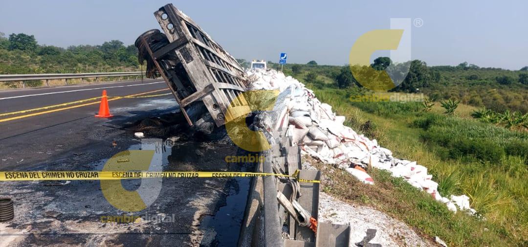 Papantla, Ver.- Tras finalizar los trabajos forenses por parte de las autoridades judiciales cuando ocurriera un fatídico accidente el pasado 15 de junio del presente año en la autopista Cardel-Poza Rica en las inmediaciones l del puente “Arroyo Verde”, en el que un tráiler cargado con abono se impactó de forma aparatosa contra la estructura del puente y se incendió, quedando atrapado su conductor quien perdió la vida al terminar calcinado.