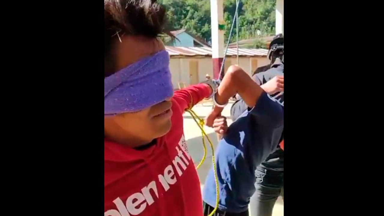 Mediante un video que circula en redes sociales, se observa a dos personas, quienes aparecen esposados y amarrados con lazos y los ojos vendados, en la cancha de la comunidad Oxinam de ese municipio.