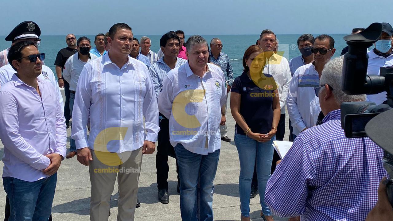 El secretario de Seguridad Pública estatal, Hugo Gutiérrez Maldonado, en compañía de empresarios transportistas, encabezó el evento de banderazo para el inicio de las operaciones de los camiones.