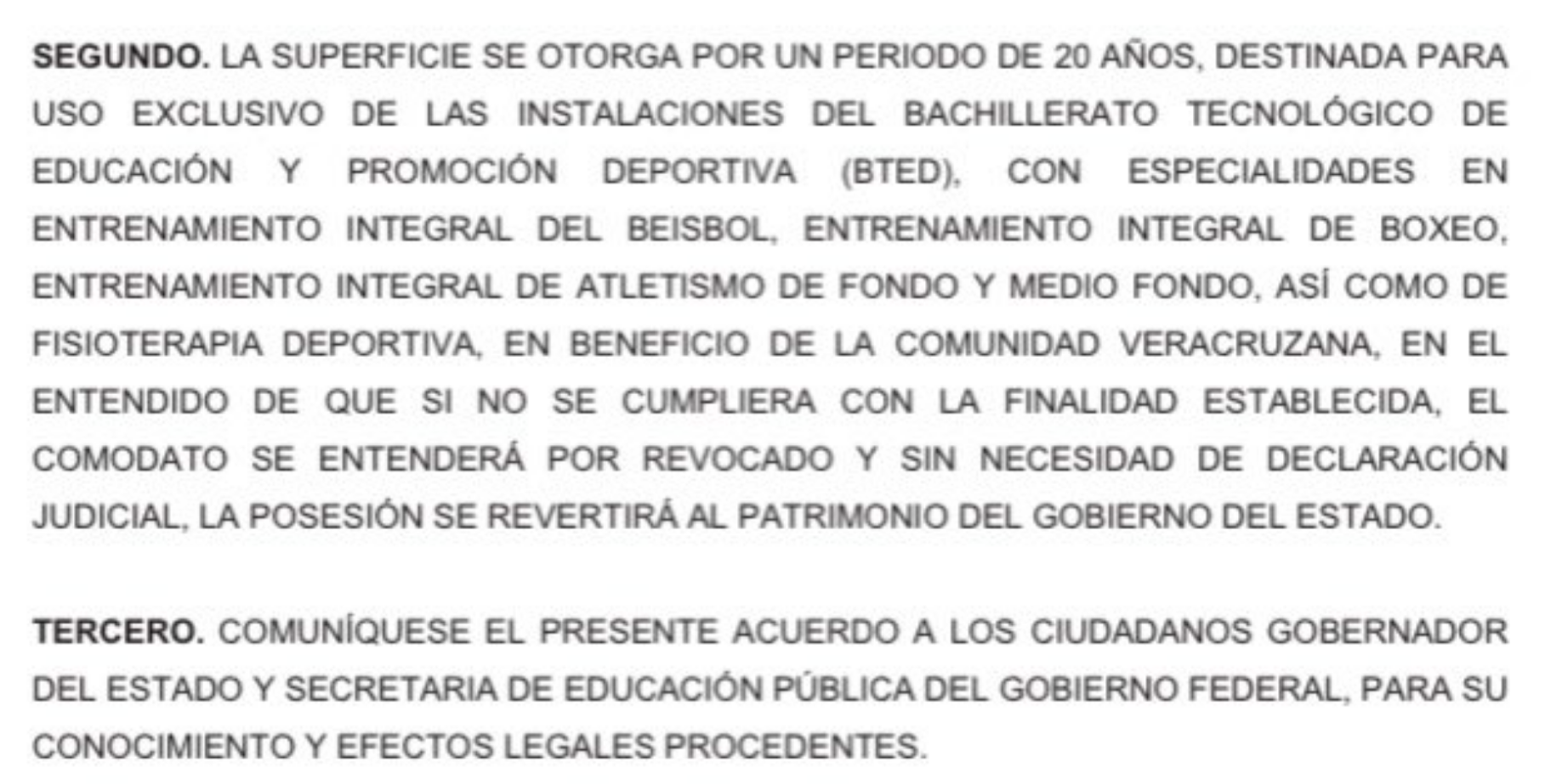 El documento advierte que el recinto deberá emplearse exclusivamente a especialidades en entrenamiento integral de béisbol, boxeo, atletismo de fondo y medio fondo, así como fisioterapia; los estudiantes tendrán acceso a becas, estancia y alimentos subsidiados para que continúen con su formación integral