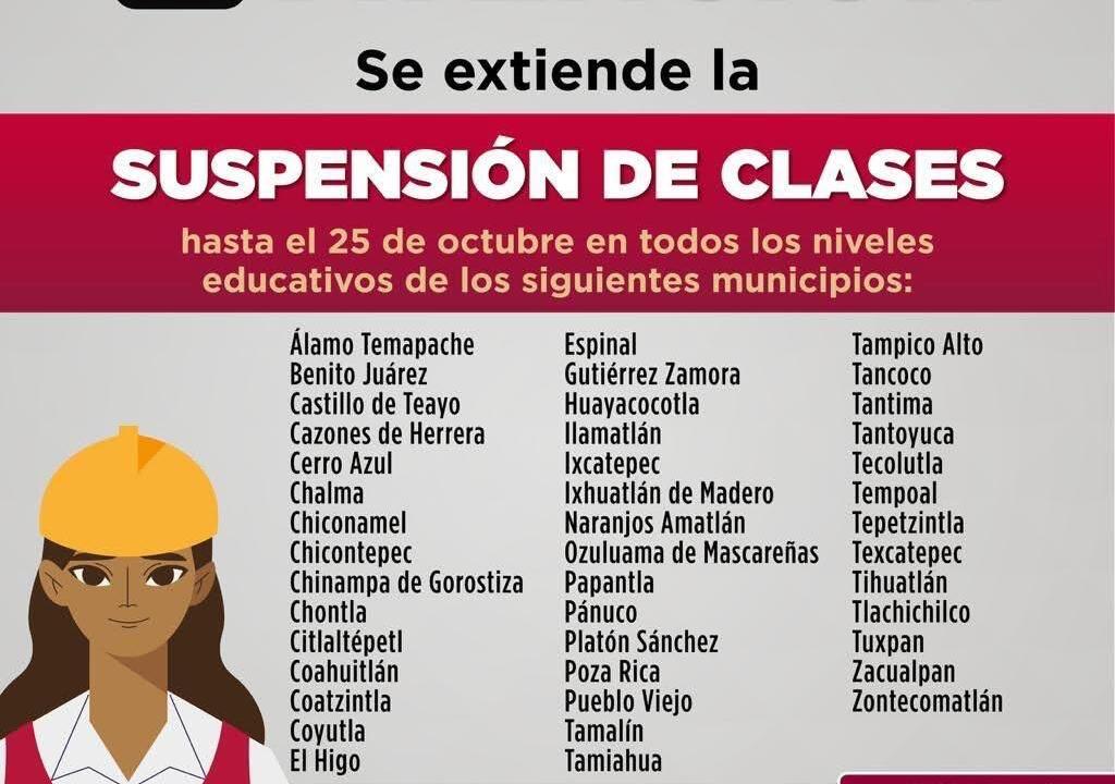 El Comité Estatal de Emergencias extendió hasta el 25 de octubre la suspensión de clases en 43 municipios del norte de Veracruz.