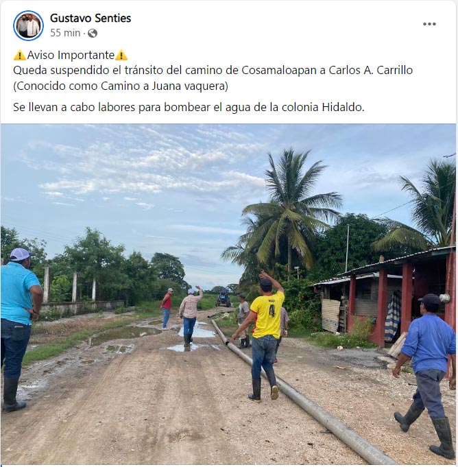 En el mensaje publicado puede leerse: “Queda suspendido el tránsito del camino de Cosamaloapan a Carlos A. Carrillo, (Conocido como Camino a Juana vaquera), se llevan a cabo labores para bombear el agua de la colonia Hidaldo.”