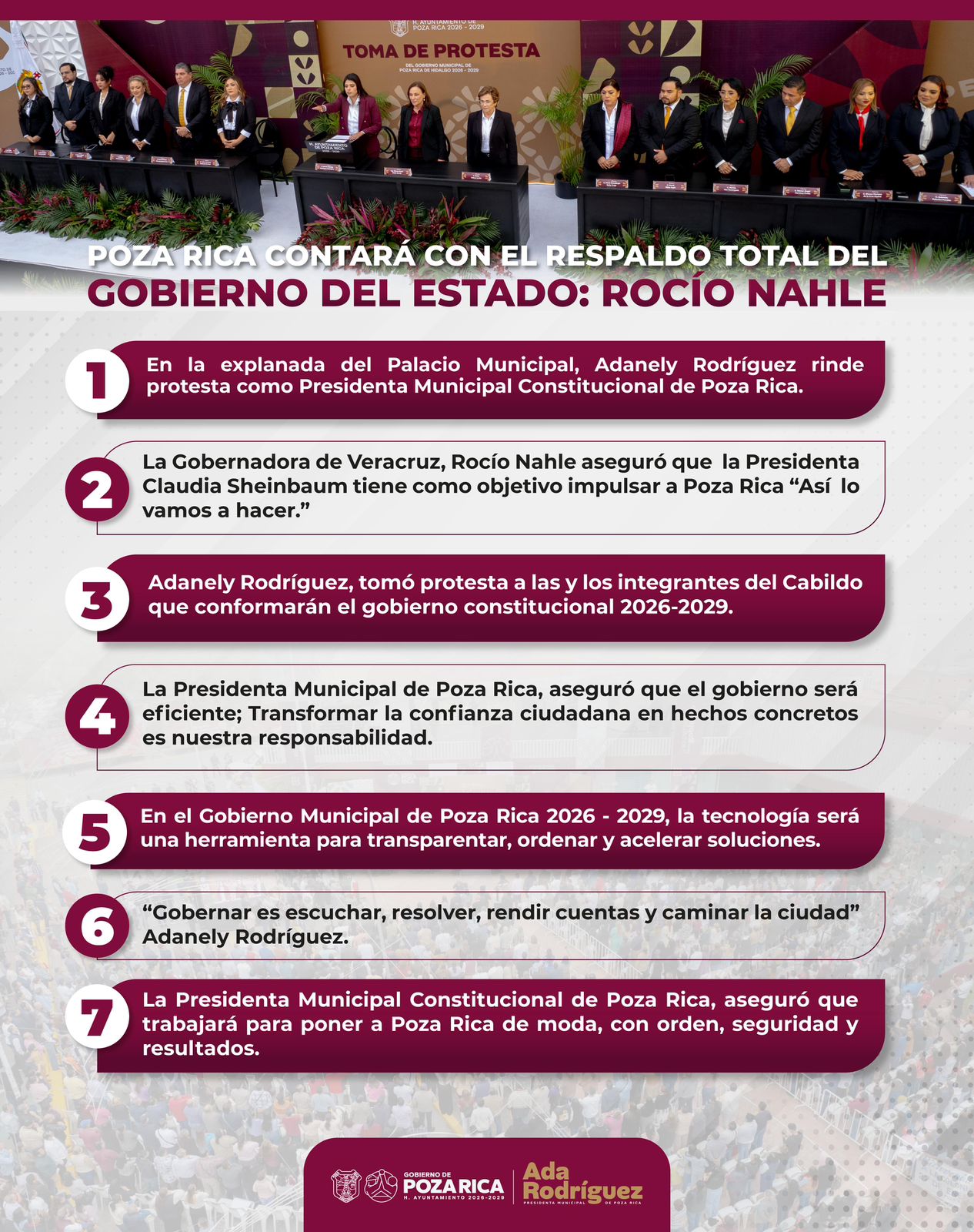 Poza Rica, Ver.- En la explanada del Palacio Municipal, Adanely Rodríguez rindió protesta como Presidenta Municipal Constitucional de Poza Rica, junto con las y los integrantes del Cabildo que conformarán el gobierno 2026–2029.