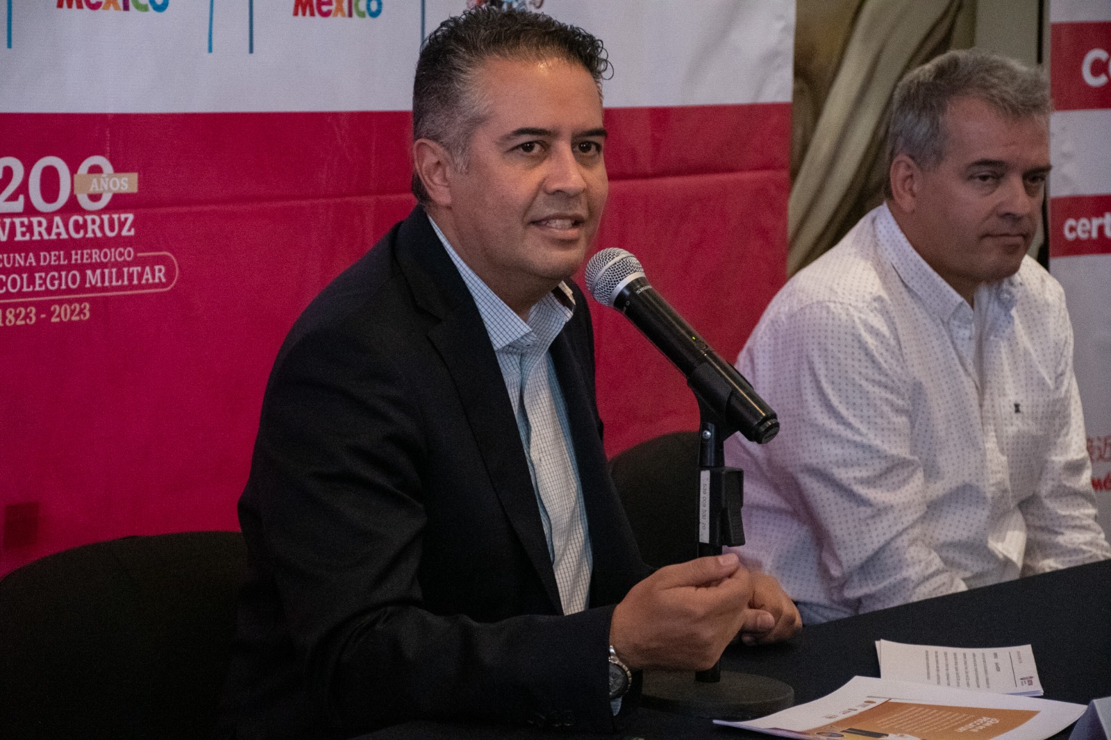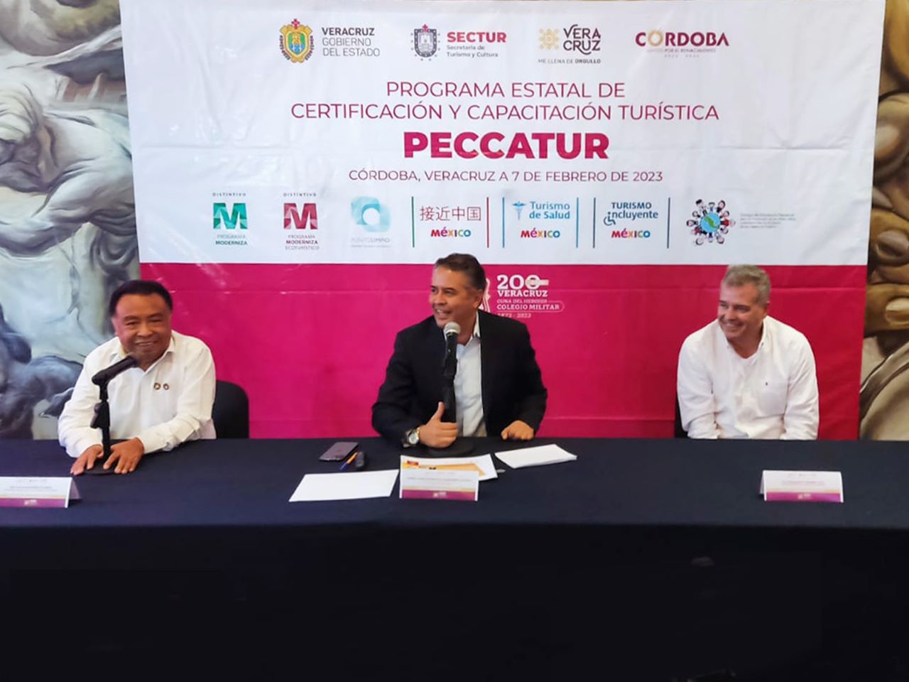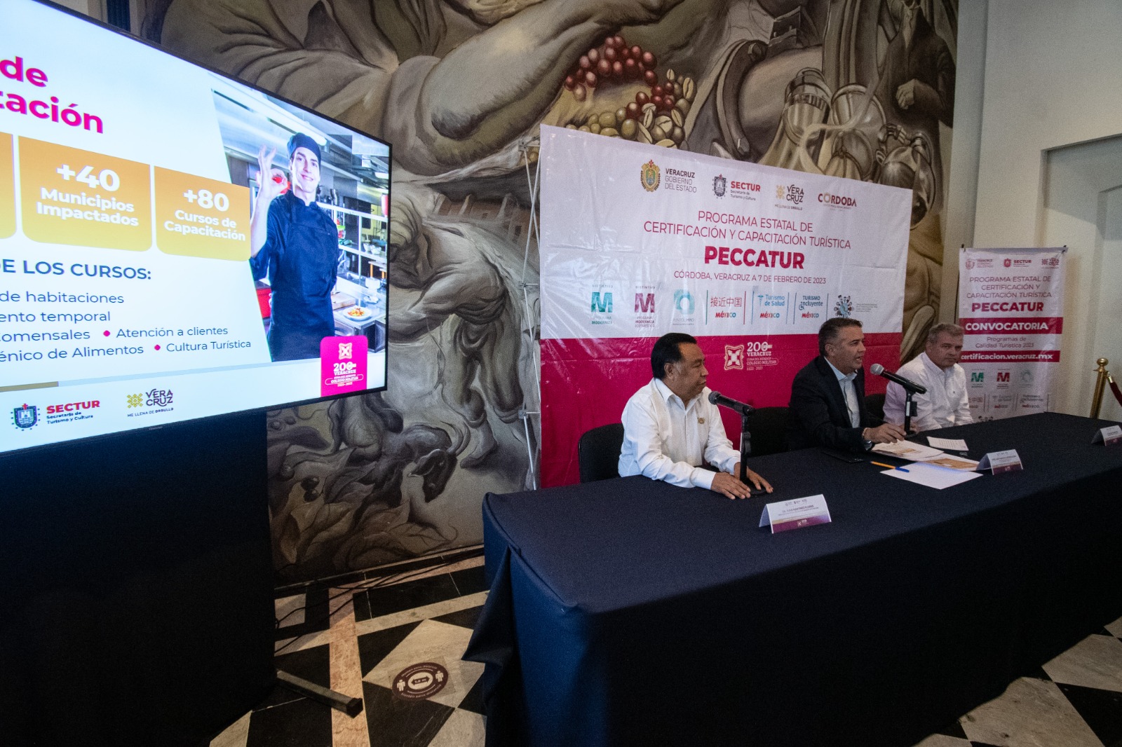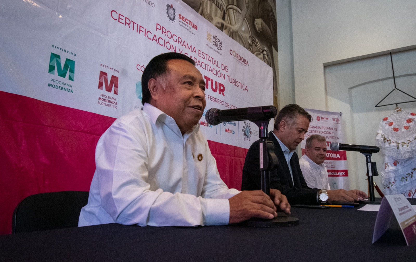 Córdoba, Ver.- El secretario de Turismo y Cultura del Estado de Veracruz (Sectur), Iván Martínez Olvera, acompañado del presidente municipal, Juan Martínez Flores, presentó en rueda de prensa, el “Programa Estatal de Certificación y Capacitación Turística”, con el objetivo de apoyar al sector empresarial con capacitaciones y certificaciones, lo que abonará a una mejor derrama turística y económica.