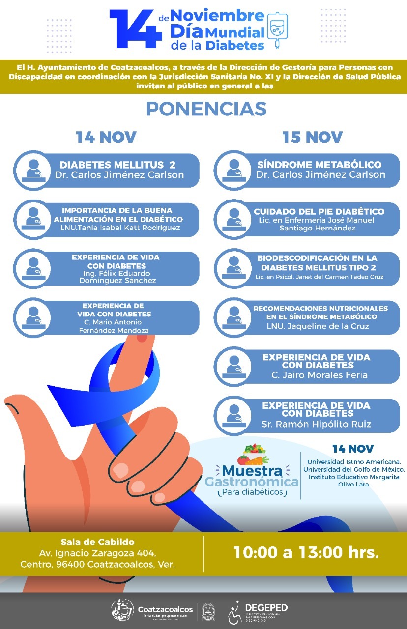 Coatzacoalcos, Ver.- La Dirección de Gestoría para Personas con Discapacidad del gobierno de Coatzacoalcos, en coordinación con diversas áreas municipales, conmemorará los días 14 y 15 de noviembre el Día Mundial de la Diabetes, para prevenir, detectar y hacer conciencia de esta enfermedad.