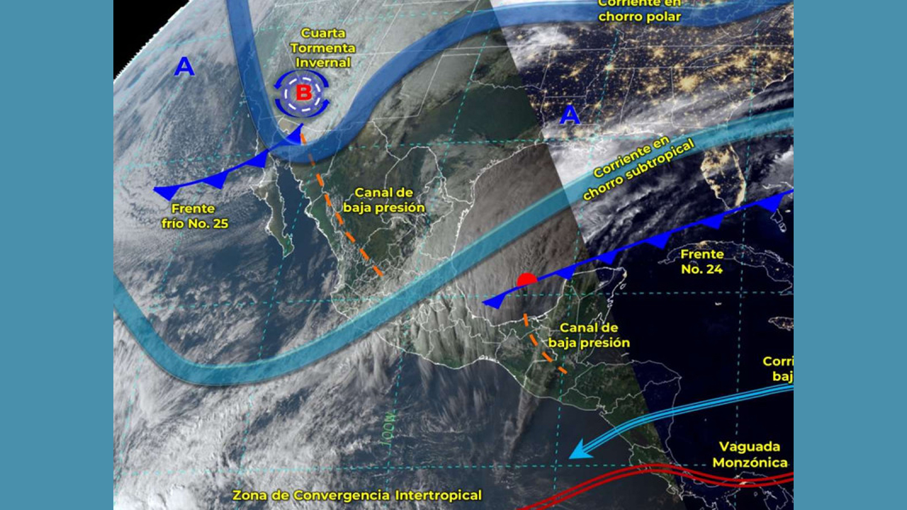 La Cuarta Tormenta Invernal se ubicará sobre el norte del país, mientras que el frente frío 25 recorrerá rápidamente el norte, noreste y hacia la noche ingresará al Golfo de México; ambos sistemas generarán lluvias, chubascos y vientos intensos con tolvaneras.