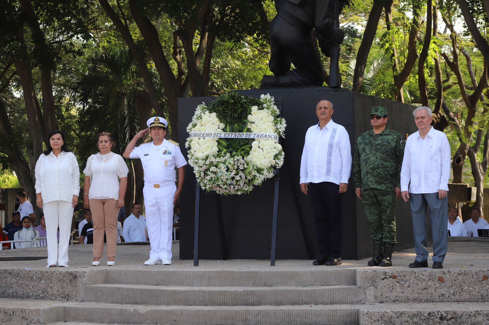 Autoridades civiles y militares colocaron ofrenda floral y montaron guardia de honor ante la estatua del prócer tabasqueño que logró la expulsión de las tropas invasoras en 1864.