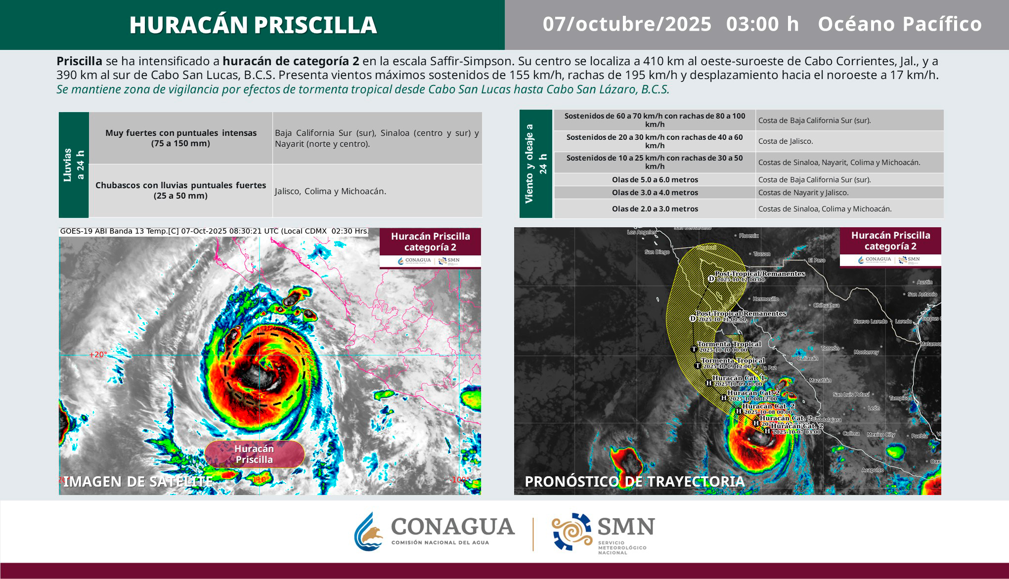 En un comunicado, el Servicio Meteorológico Nacional informó que ‘Priscilla’ se ubica a 410 kilómetro al oeste-suroeste de Cabo Corrientes, Jalisco, y a 390 kilómetros al sur de Cabo San Lucas, Baja California Sur.