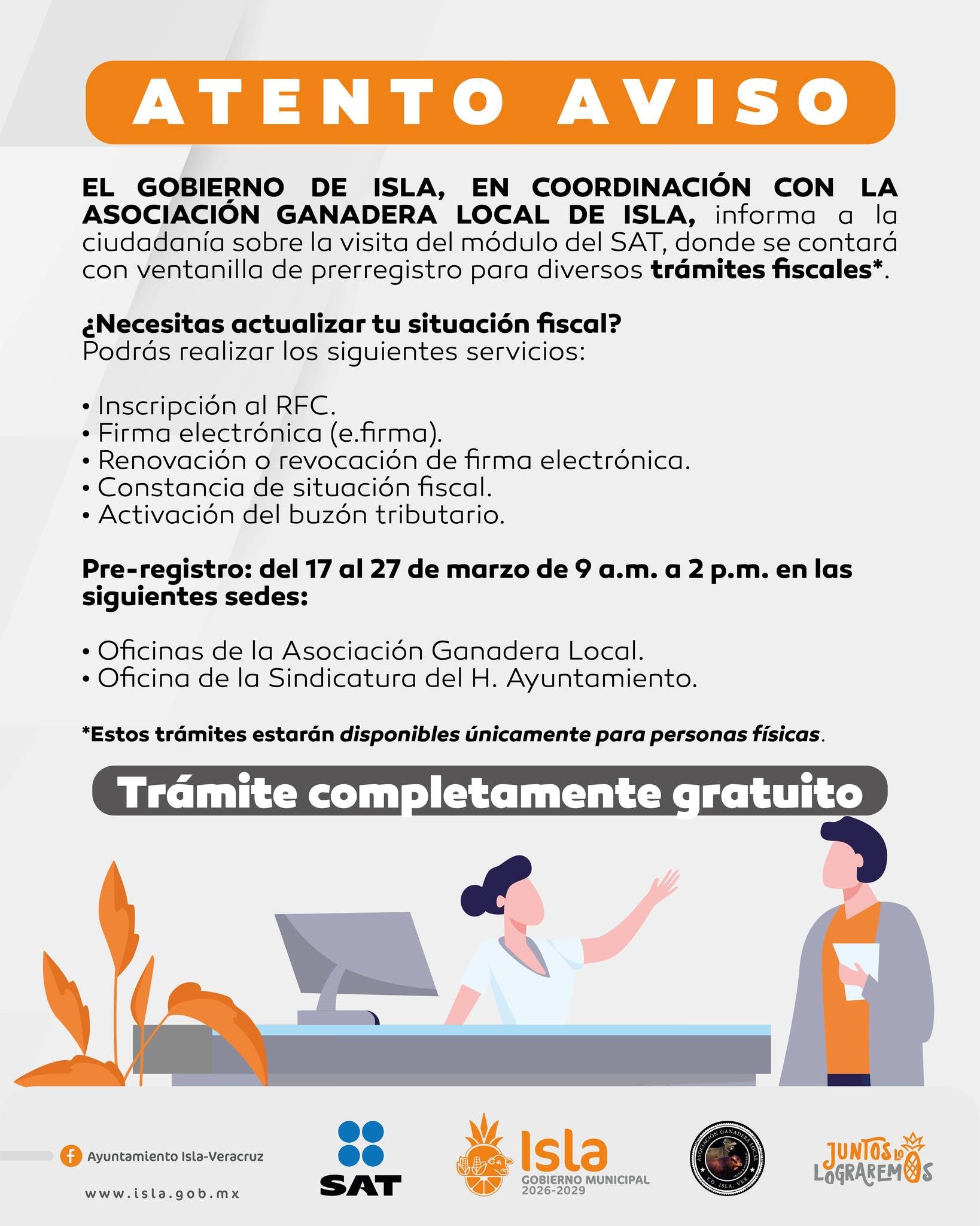 Isla, Ver.- El Gobierno de Isla que preside Ramón Martínez Tress, en coordinación con la Asociación Ganadera Local de Isla, Veracruz, informa que próximamente se contará con la visita del módulo del SAT, donde se realizará ventanilla de prerregistro para distintos trámites fiscales.