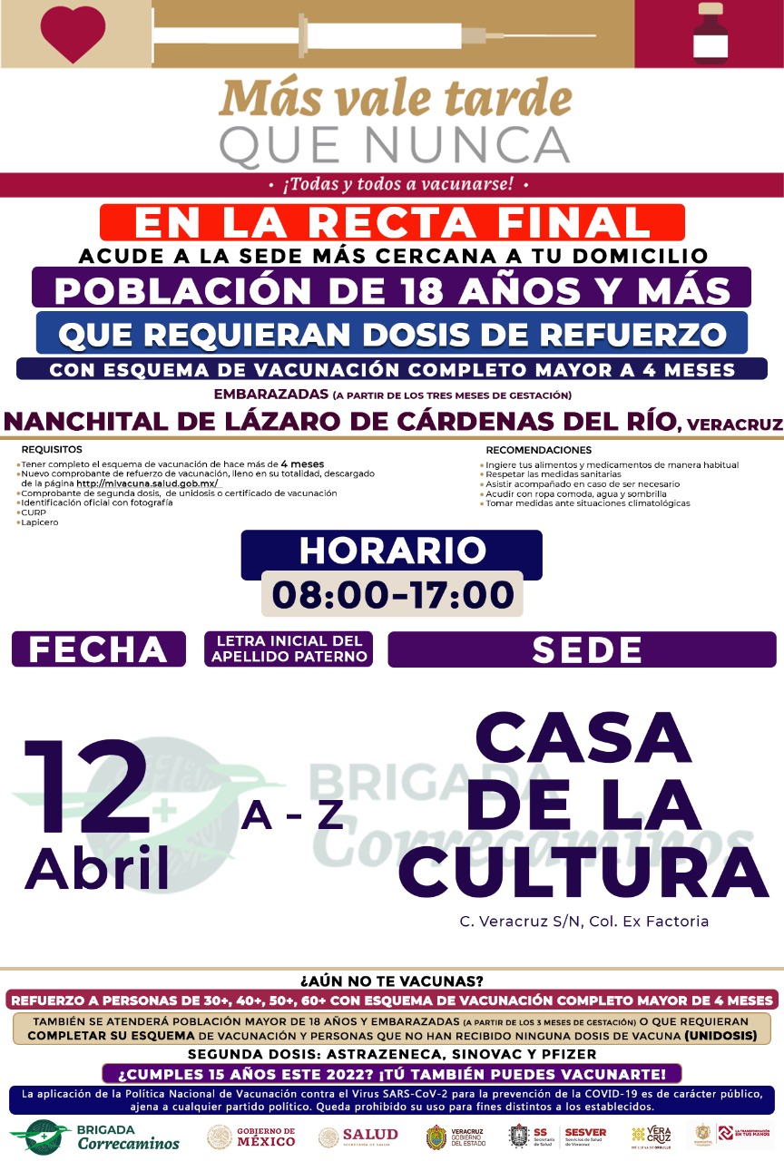 Nanchital, Ver.- El próximo 12 de abril, de 8:00 am a 5:00 pm se llevará a cabo una intensa jornada de vacunación de refuerzo contra Covid-19 para personas rezagadas de 18 años en adelante, en las instalaciones de Casa de Cultura.