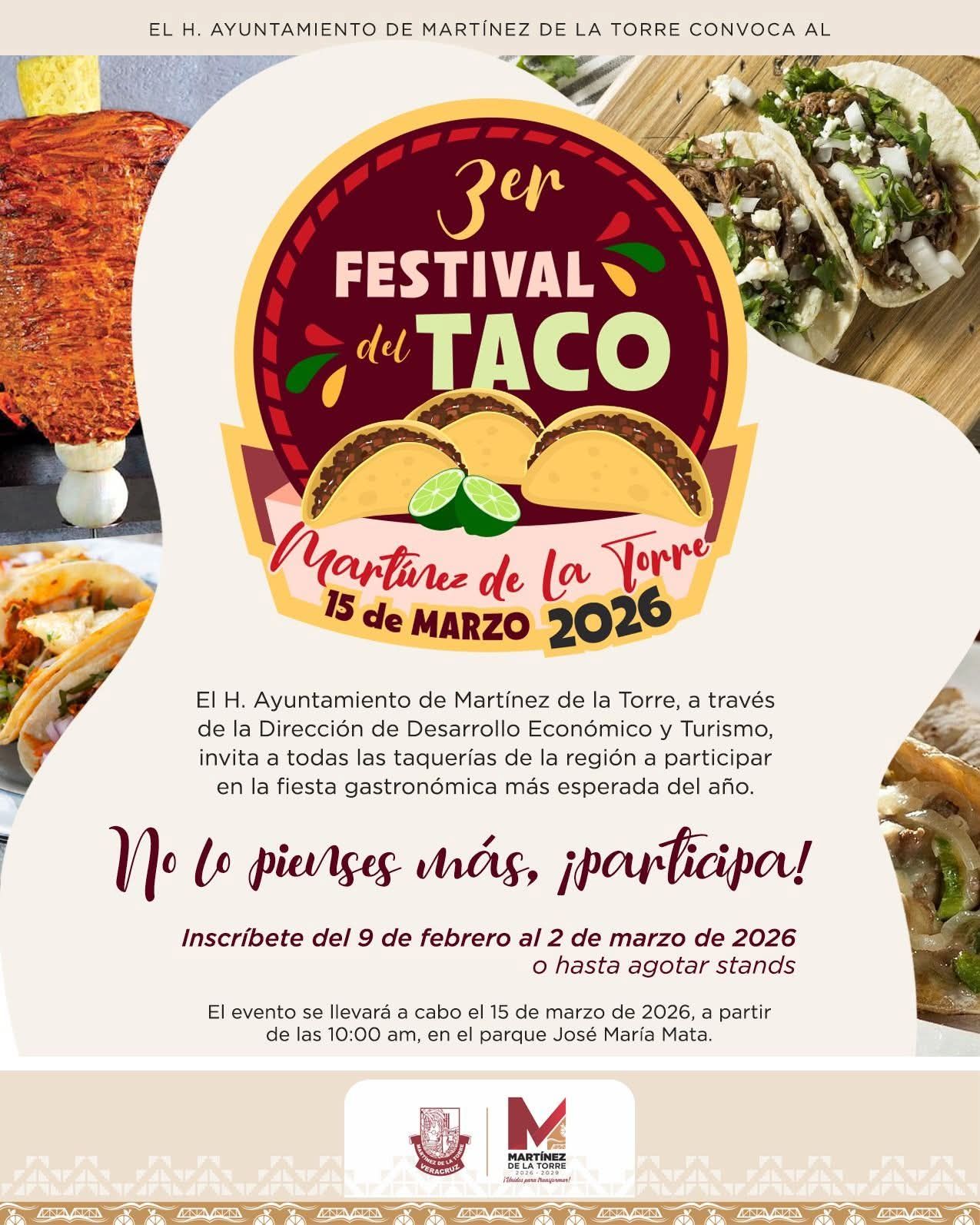 Martínez de la Torre, Ver.- El H. Ayuntamiento de Martínez de la Torre que preside Modesto Velázquez Toral, a través de la Dirección de Desarrollo Económico y Turismo, invita a taqueros, parrilleros y maestros del trompo a participar en el 3° Festival del Taco, que se realizará el domingo 15 de marzo de 2026, a partir de las 10:00 a.m., en el Parque José María Mata.