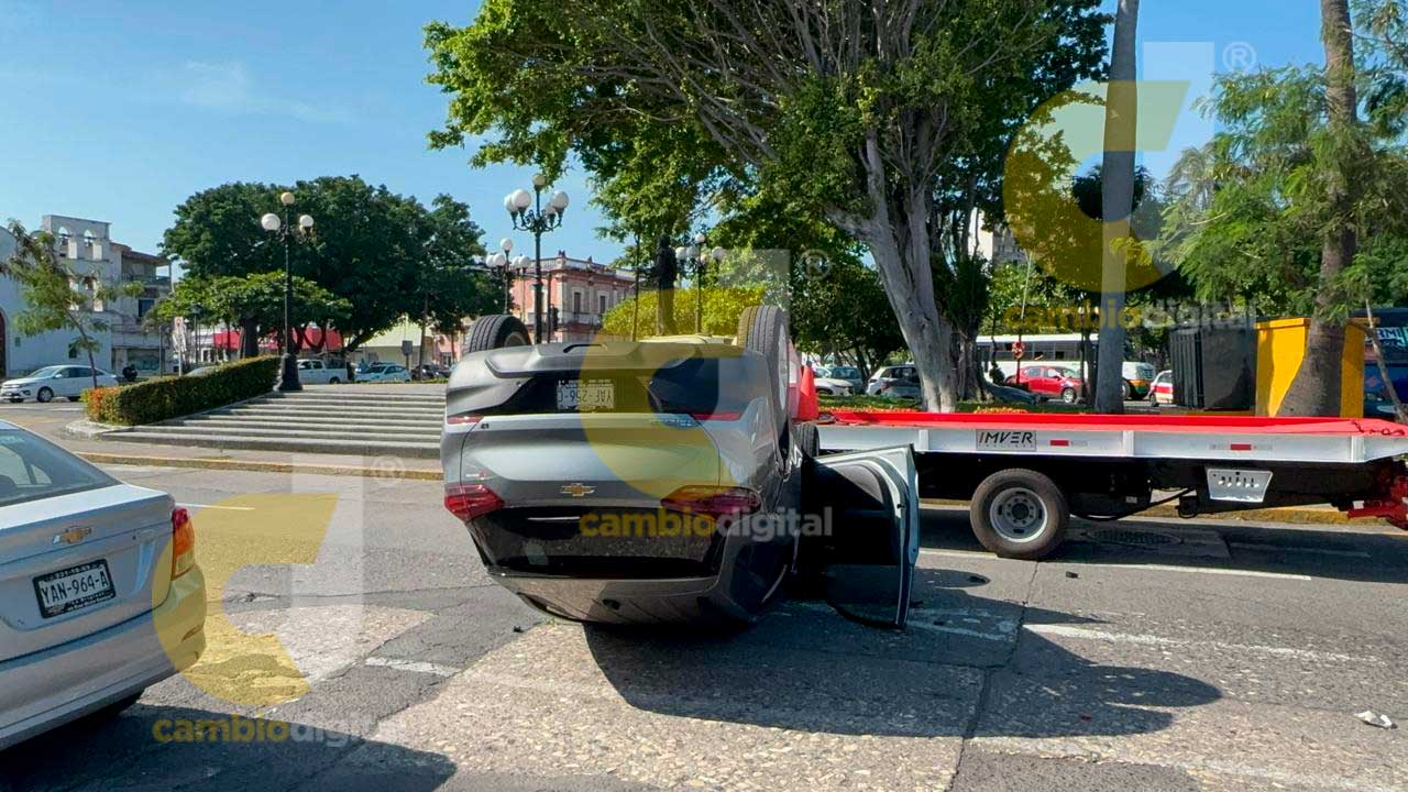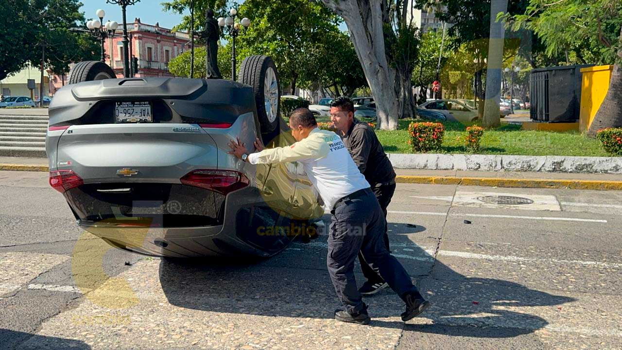 Veracruz, Ver.- Una camioneta Tracker quedó volcada con las llantas para arriba, al ser impactada por un automóvil Kia que no respetó la preferencia de paso en la calle Prim y Víctimas del centro histórico de Veracruz.