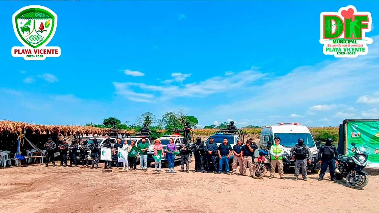 Playa Vicente, Ver.- Este día 27 de marzo arrancó en Playa Vicente el operativo Semana Santa Segura 2026, donde el alcalde Ramiro Martínez Amezcua, y la síndica, Trinidad Bautista Martínez, dieron el banderazo de salida a las unidades de la Policía Municipal, Policía Estatal y Protección Civil Municipal que estarán al pendiente de la seguridad durante este periodo vacacional.
