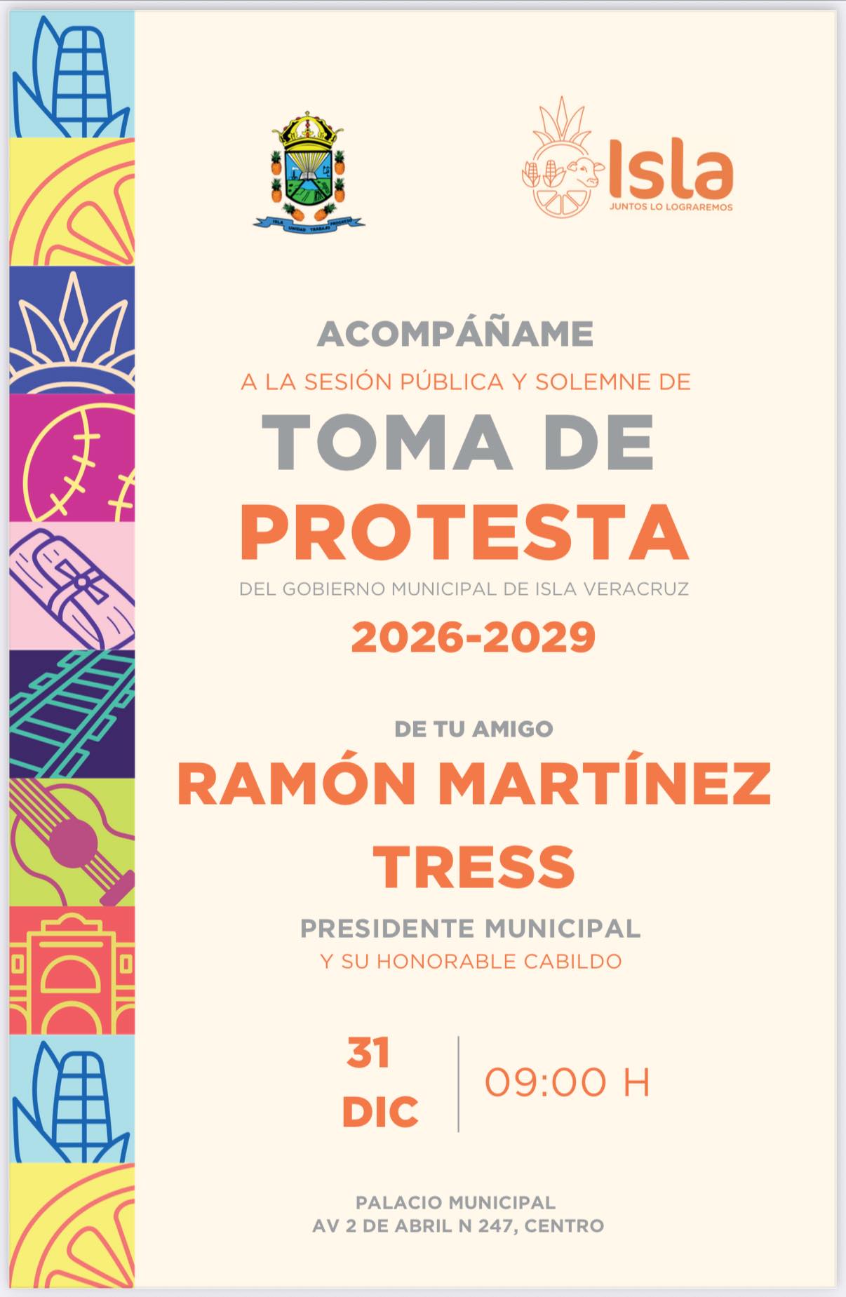 “Amigas y amigos, los invito de todo corazón para que nos acompañen en nuestra toma de protesta. Me dará mucho gusto compartir y que sean parte todos ustedes de este nuevo comienzo para nuestro Isla”, expresó Ramón Martínez Tress.