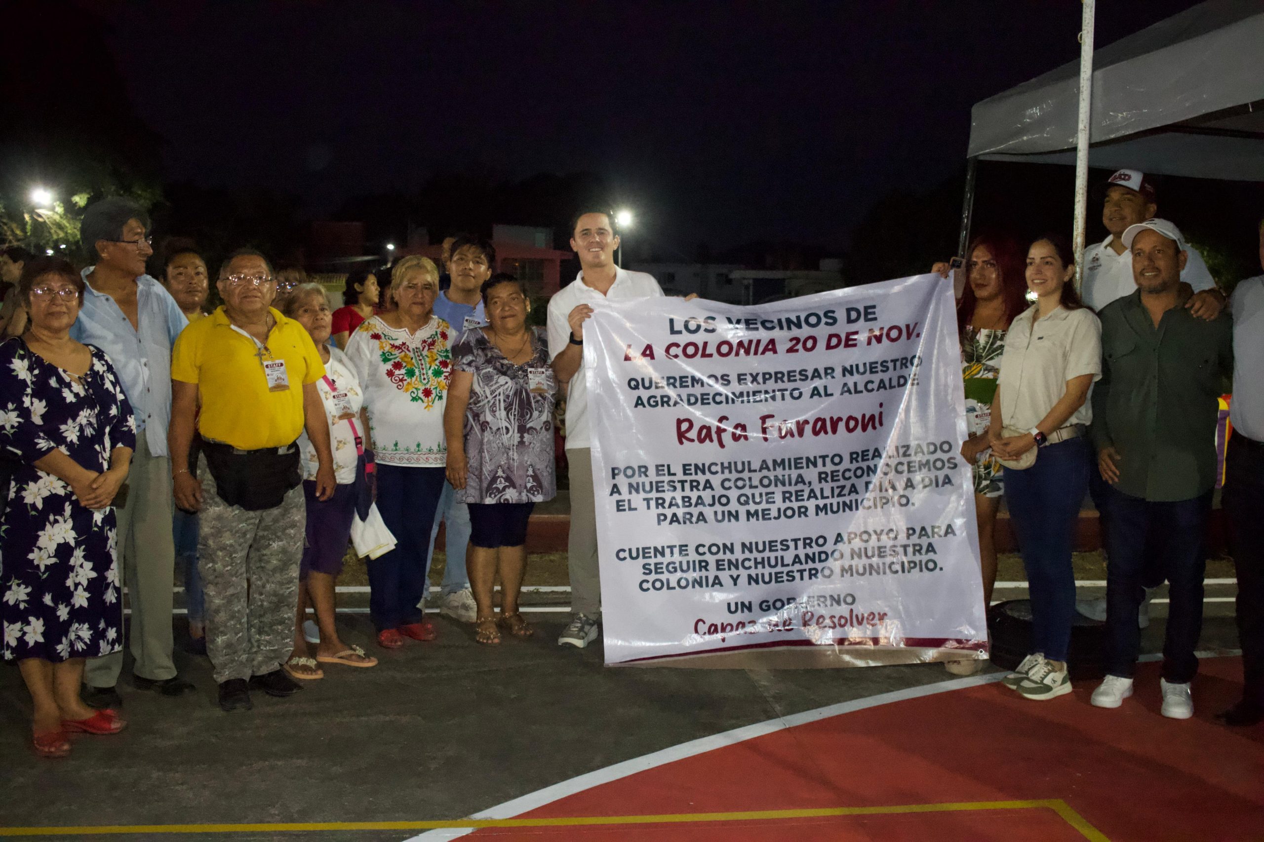Durante el programa de “Enchulamiento” en la colonia 20 de noviembre, se llevó a cabo la iluminación del parque, la cancha deportiva, limpieza de calles y banquetas, pintura en guarniciones, poda de árboles y recepción de solicitudes para diversas áreas municipales.