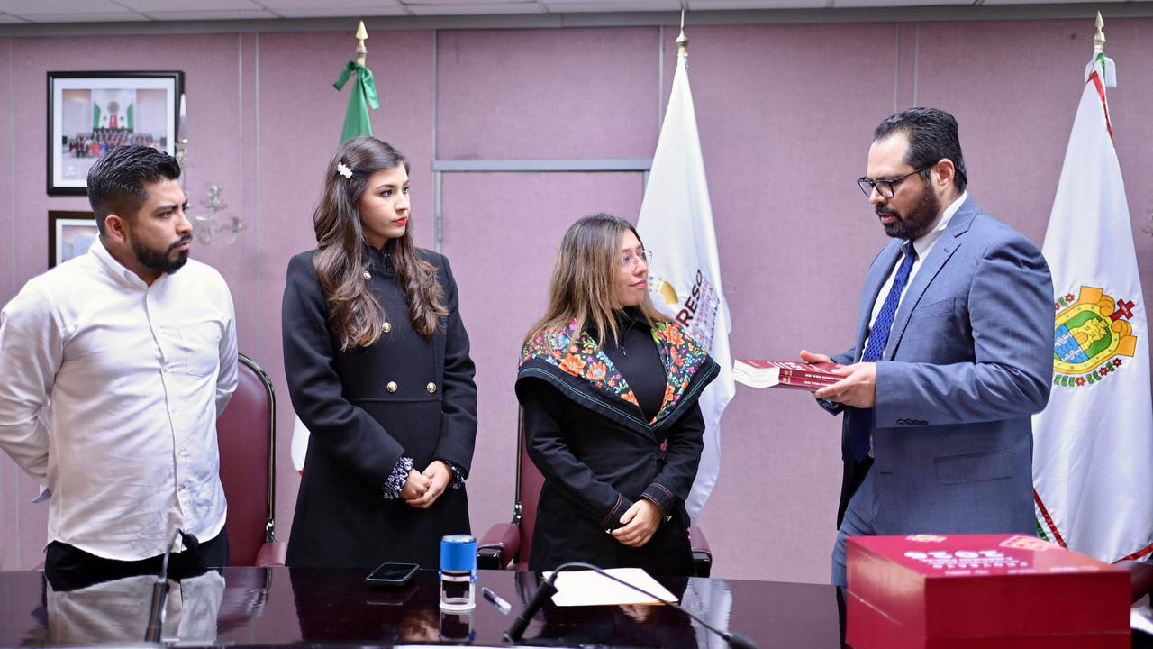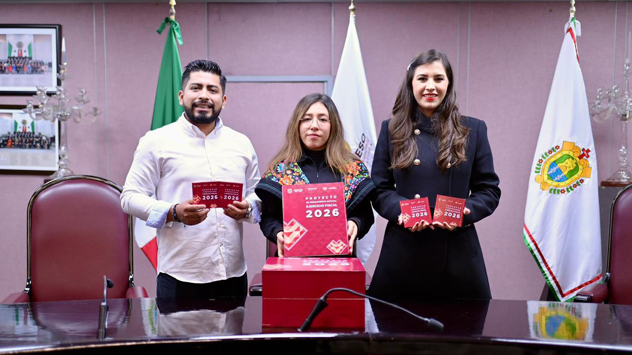 Xalapa, Ver., 31 de octubre de 2025.- La Mesa Directiva de la LXVII Legislatura del estado de Veracruz, integrada por las diputadas Naomi Edith Gómez Santos y Estefanía Bastida Cuevas y por el diputado Alejandro Porras Marín, presidenta, vicepresidenta y secretario, respectivamente, recibió del titular de la Secretaría de Finanzas y Planeación del estado (Sefiplan), Miguel Santiago Reyes Hernández, el proyecto de Ley de Ingresos y Presupuesto de Egresos, ejercicio fiscal 2026.