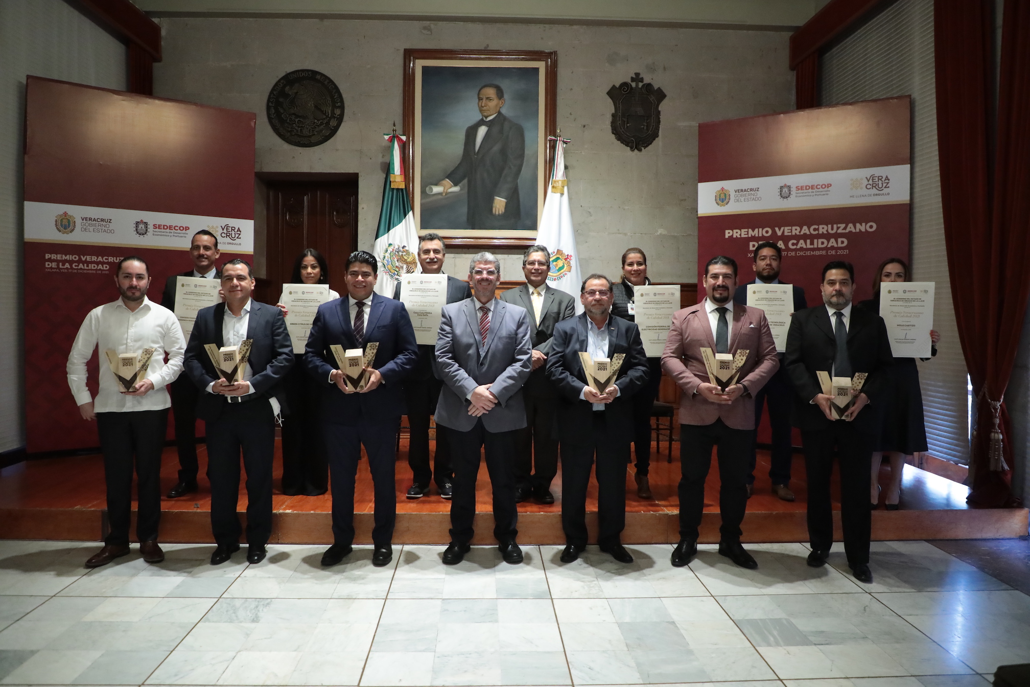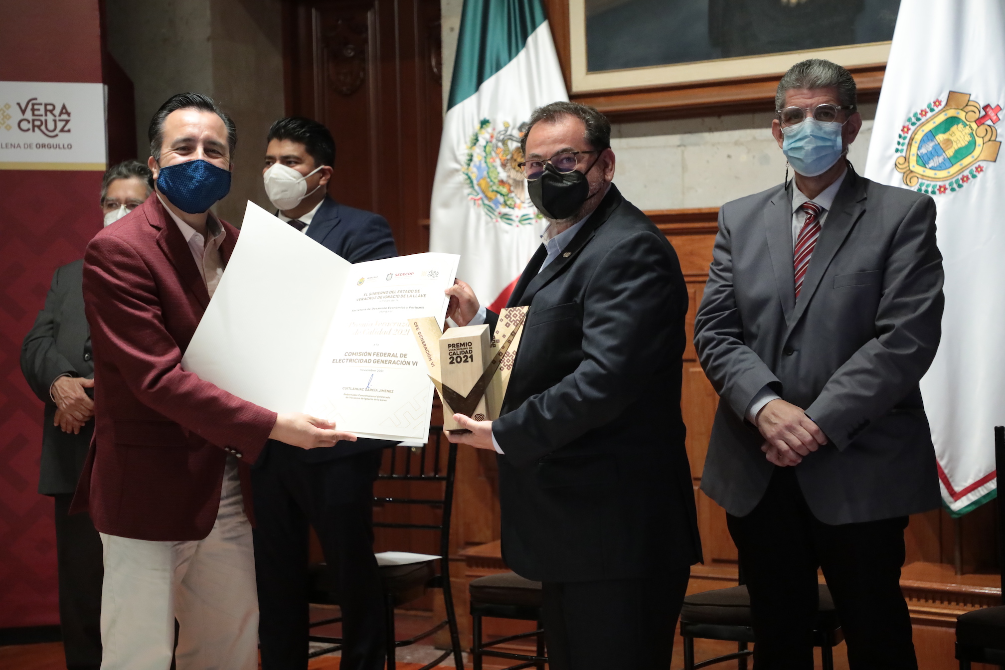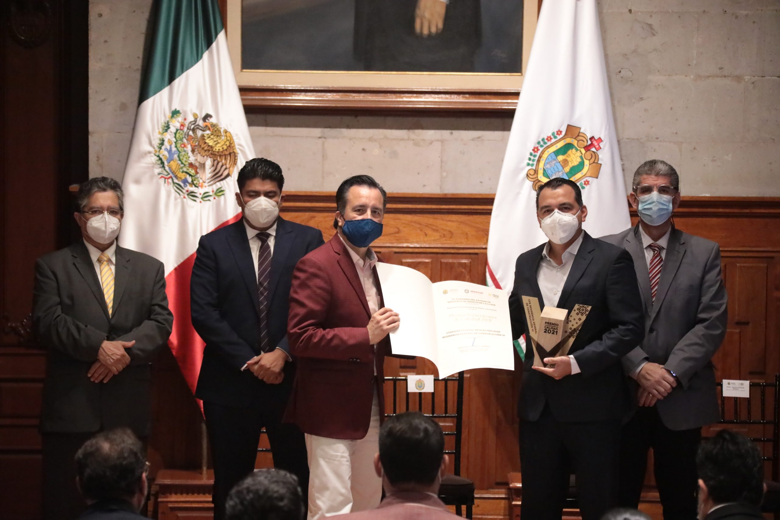 Acompañado por el titular de la Sedecop, Enrique Nachón García, el mandatario condecoró a los finalistas: Coca Cola Femsa, Green Citrus, Mole Castizo, Universidad Tecnológica del Centro de Veracruz y la Comisión Federal de Electricidad Zona de Generación VI y Residencia General de Construcción VI.