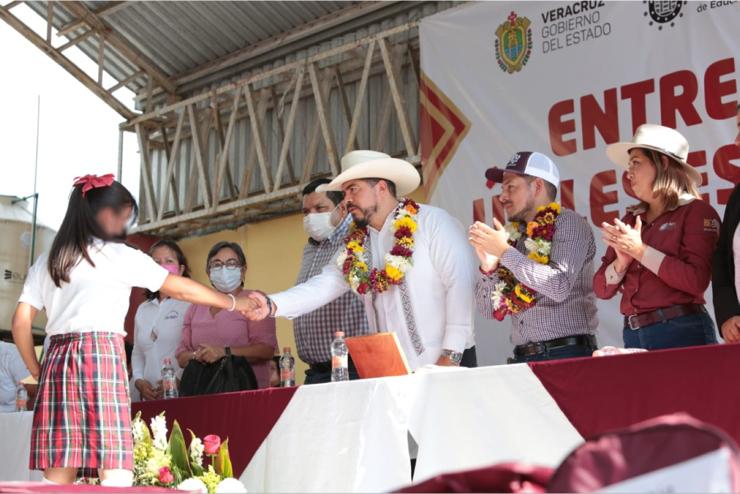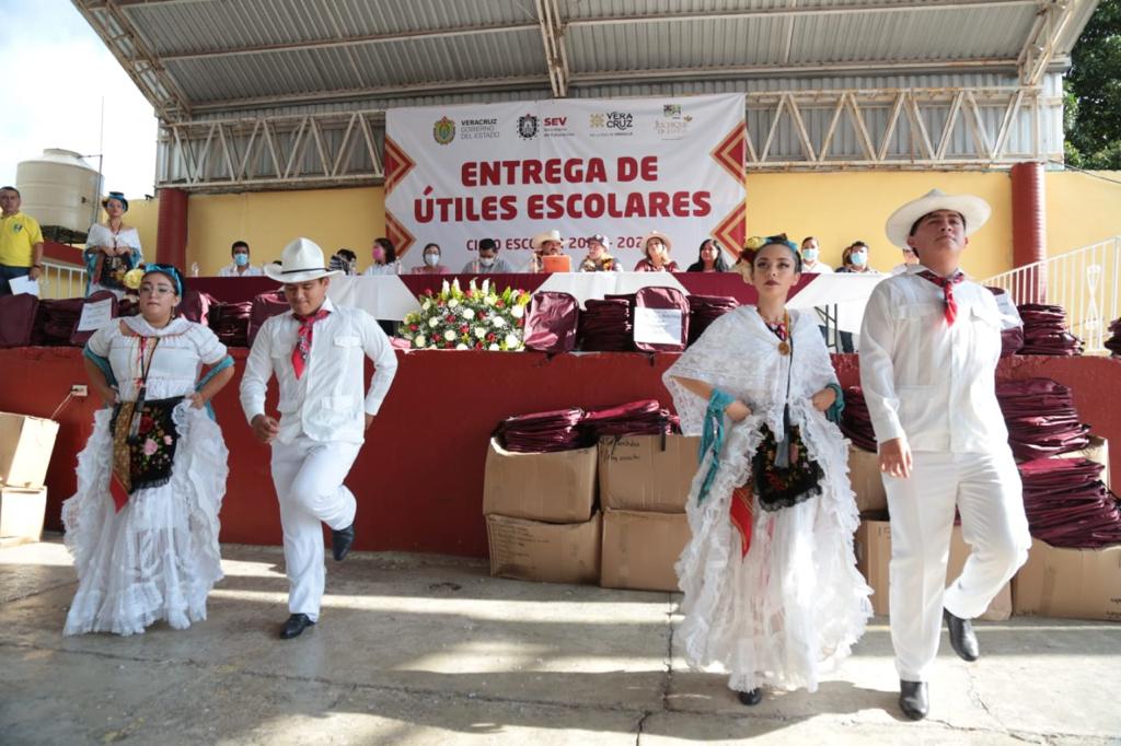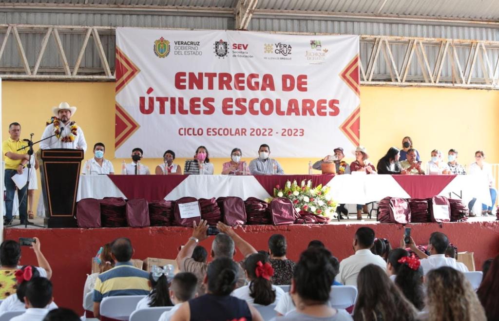 Juchique de Ferrer, Ver.- Al presidir la entrega de 582 paquetes de útiles escolares a estudiantes de primarias del municipio, el titular de la Secretaría de Educación de Veracruz (SEV), Zenyazen Escobar García, afirmó que esta administración lleva récord histórico en obras educativas.