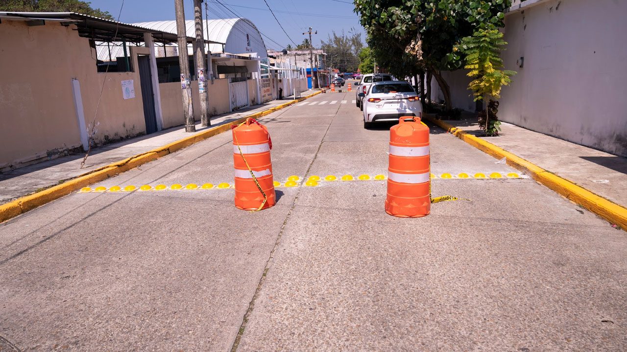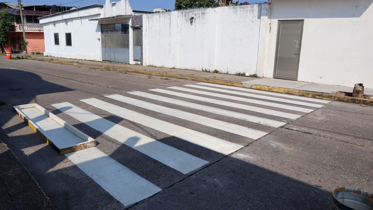 A través del Departamento de Tránsito y Vialidad, se realizó la colocación de boyas metálicas, la marcación del paso peatonal y la pintura de guarniciones con material termoplástico sobre la calle Constitución, en la colonia Ruiz Cortines, justo frente a la Escuela Primaria Adolfo Ruiz Cortines.