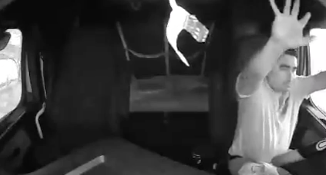 Le apuntan con sus armas, uno de ellos se sube al tráiler y ocupa el lugar del piloto, mientras el operador permanece con las manos arriba.