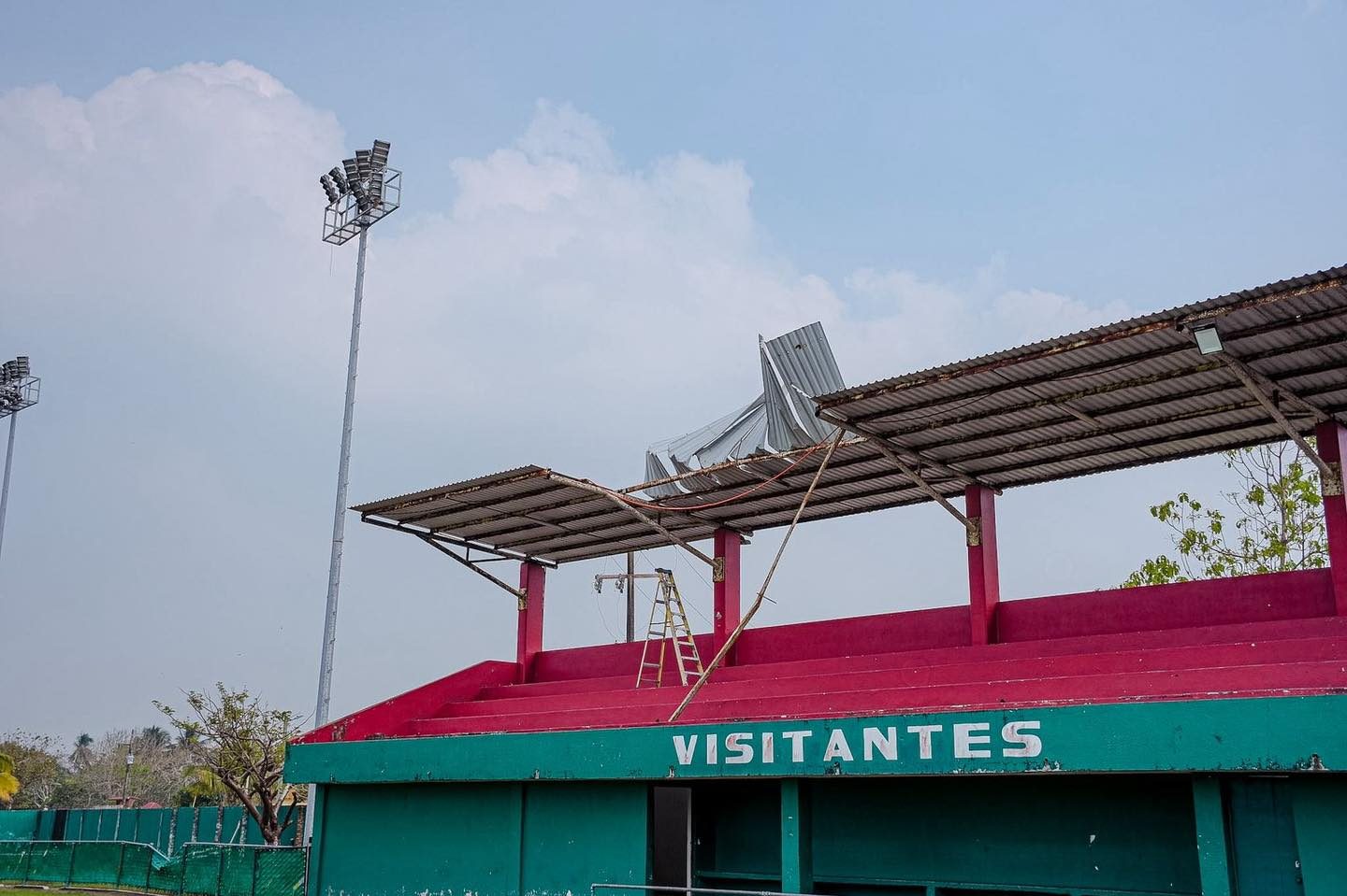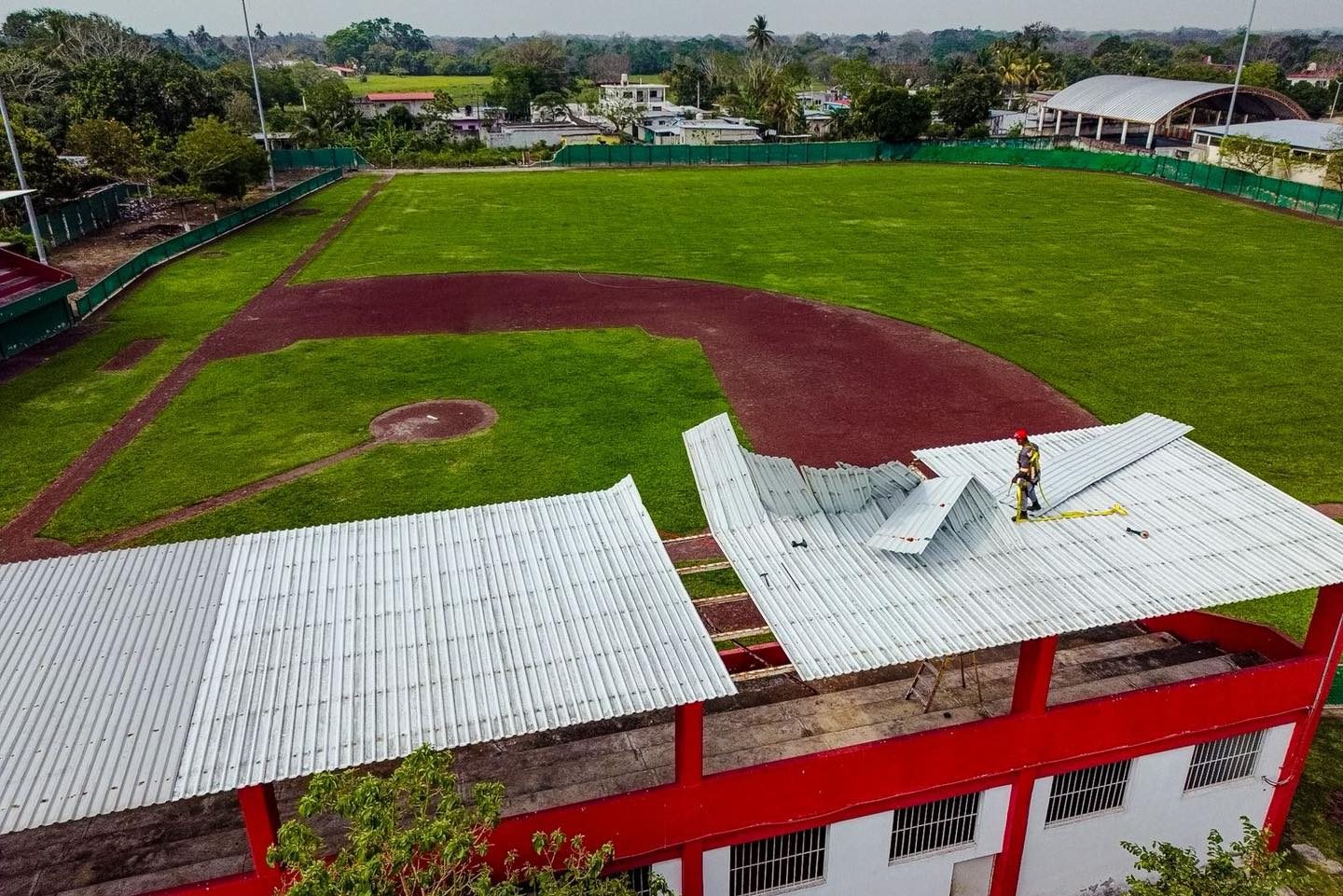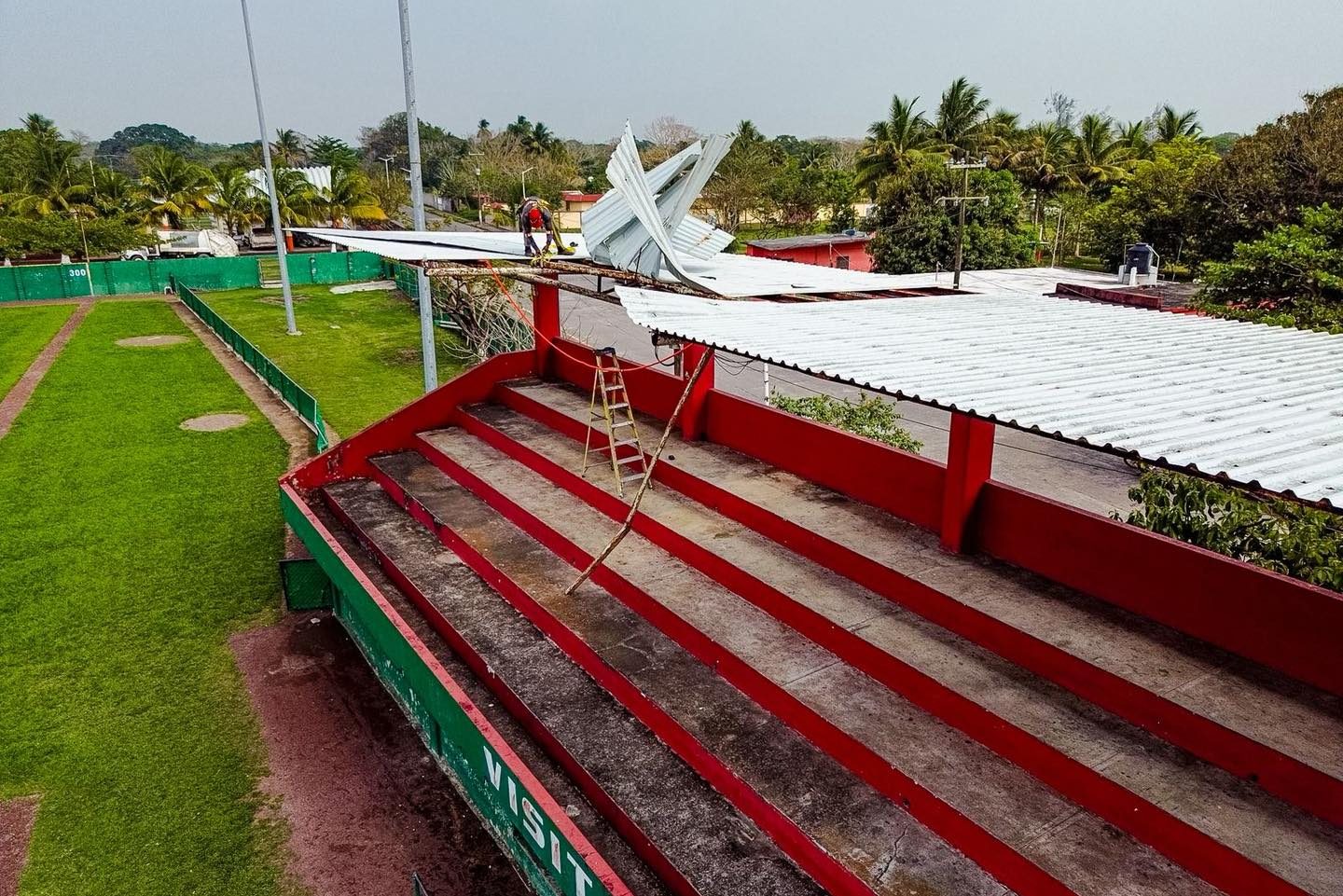 Ignacio de la Llave, Ver.- Se realizan trabajos de mantenimiento en la Unidad Deportiva de Ignacio de la Llave, en preparación para el partido de béisbol internacional, tras los daños ocasionados por el norte.
