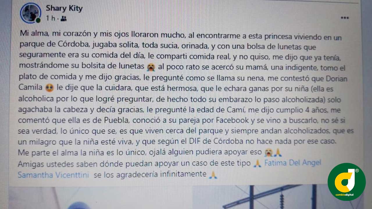 En la misma publicación, la cibernauta solicitó el apoyo de amigos para que le ayudaran a que el caso llegara a manos del DIF municipal, al expresar su preocupación por la pequeña, ya que sus padres casi siempre andan en estado de ebriedad.