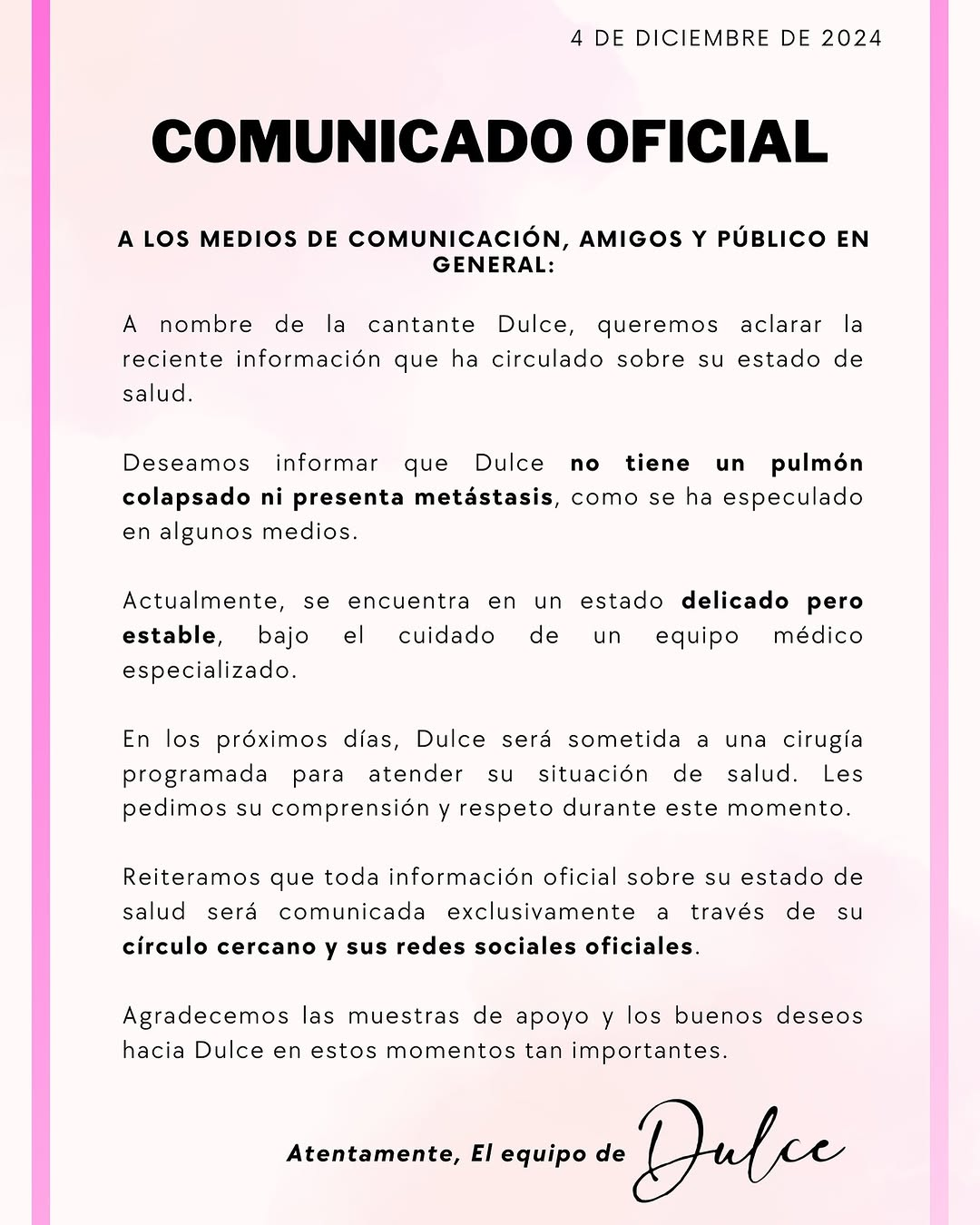 En un comunicado emitido por el equipo de la artista, se reiteró que la salud de Dulce es delicada, aunque estable, y que su evolución se encuentra bajo supervisión médica constante.