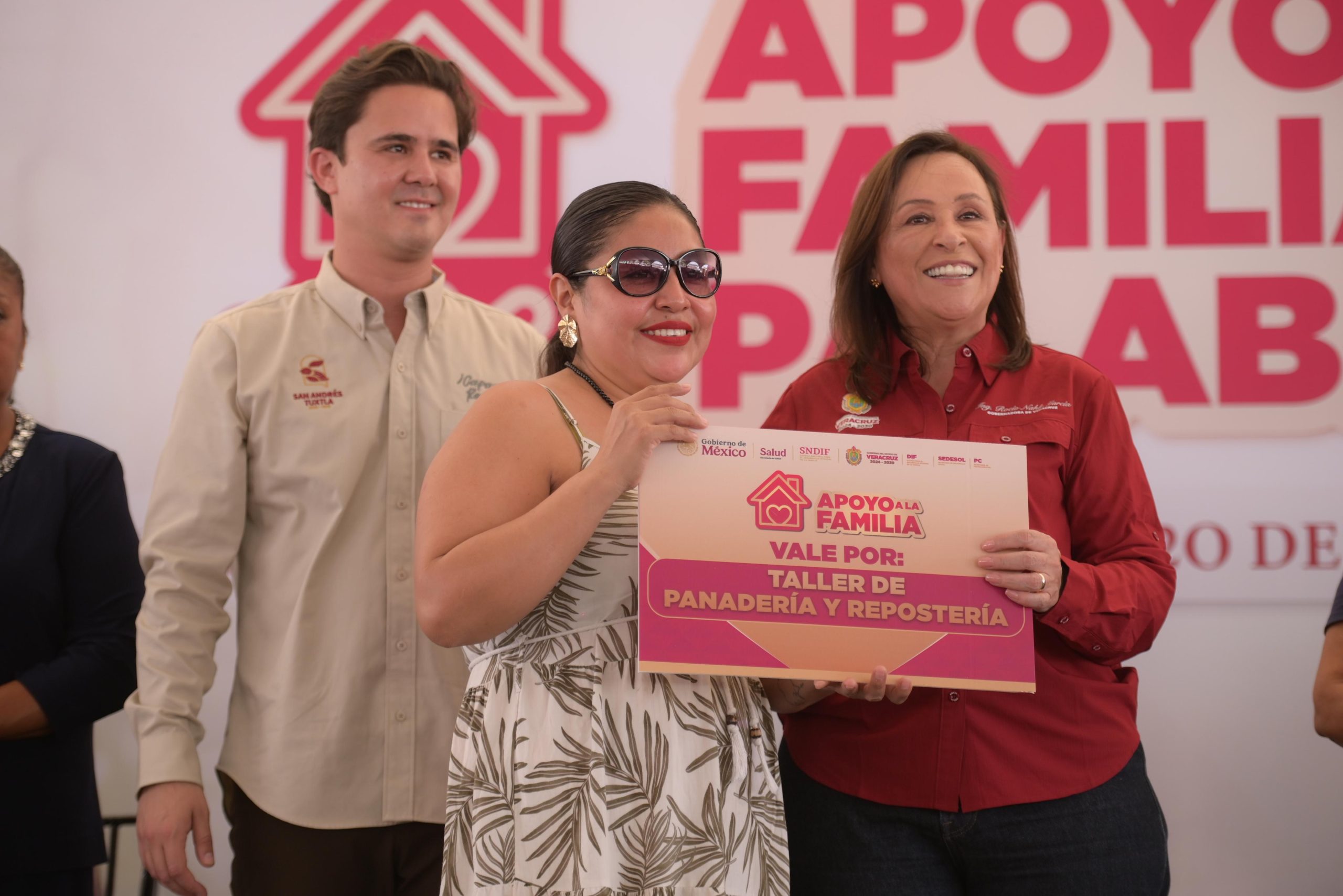 En la Unidad Deportiva ESBIO de San Andrés Tuxtla, la mandataria encabezó el arranque y primera entrega de los programas Apoyo a la Palabra y Apoyo a la Familia, estrategia conjunta de la Secretaría de Desarrollo Social y el Sistema Estatal DIF que, en 2026, se extenderá a 112 municipios con una inversión global de 200 millones de pesos.