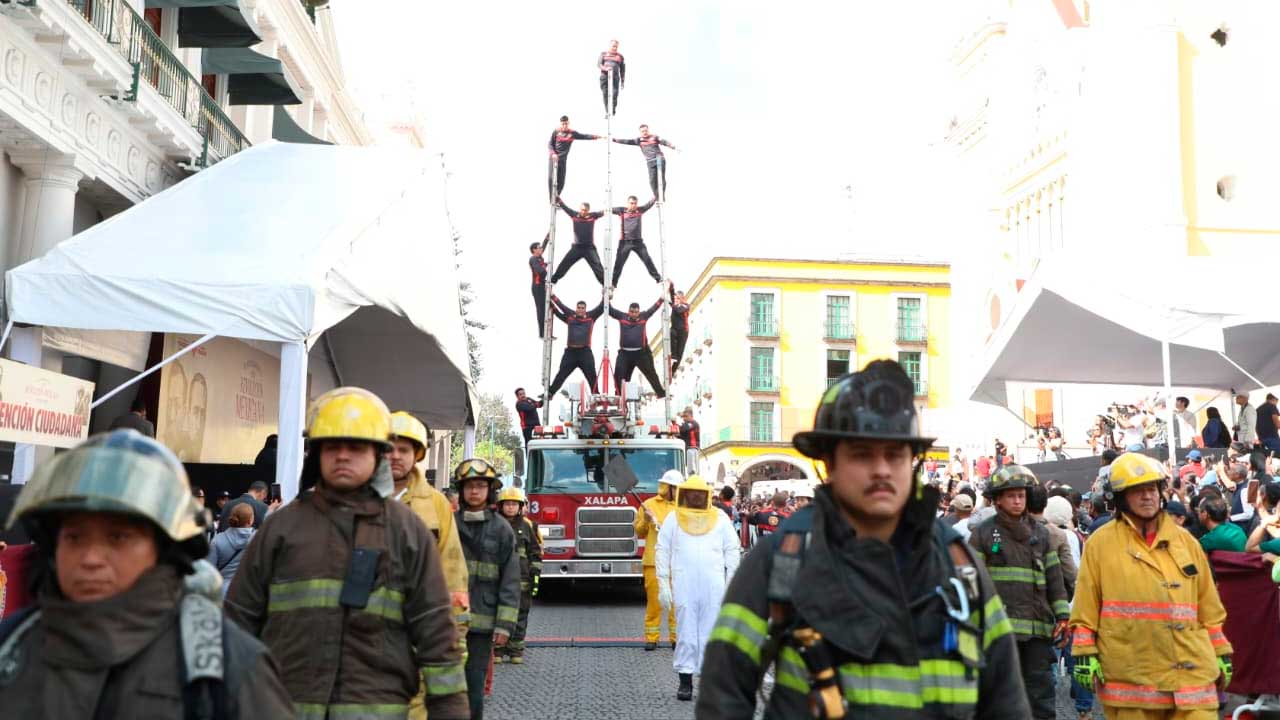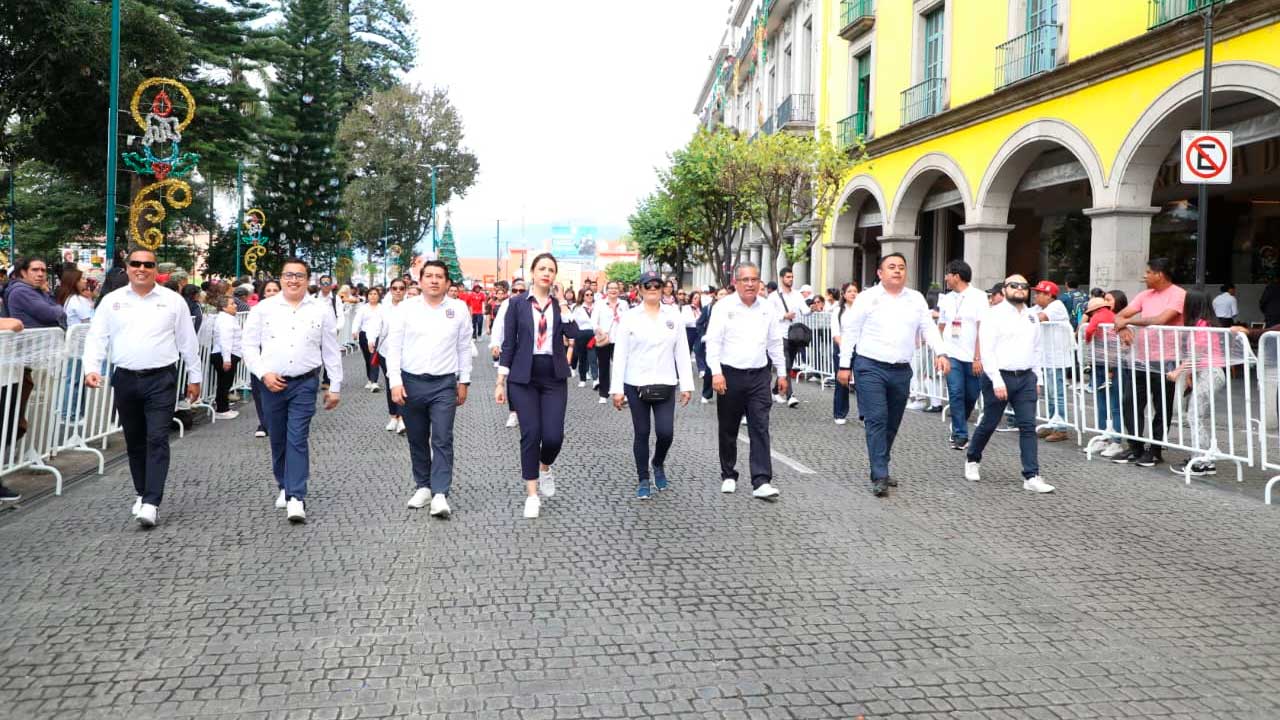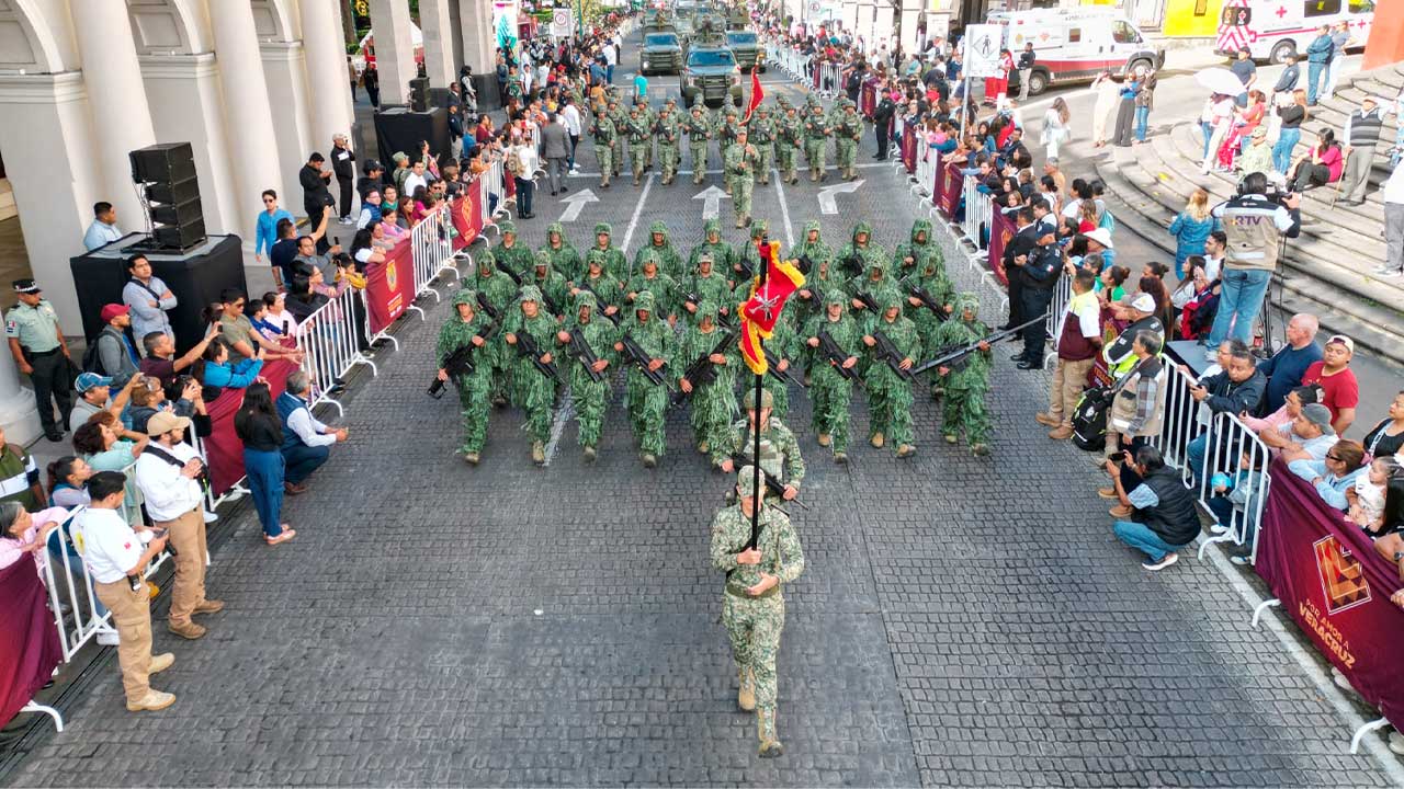 Desde el palco principal en los bajos del Palacio de Gobierno, la jefa del Ejecutivo Rocío Nahle García, acompañada por representantes de los tres Poderes del Estado y mandos militares y navales, encabezó la ceremonia en la que participaron 4 mil 580 elementos que recorrieron las calles del Centro Histórico de Xalapa, desde el Palacio Municipal hasta el parque Los Berros, en un trayecto aproximado de hora y media.
