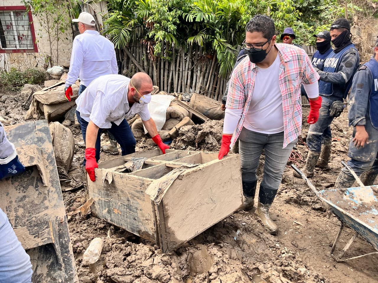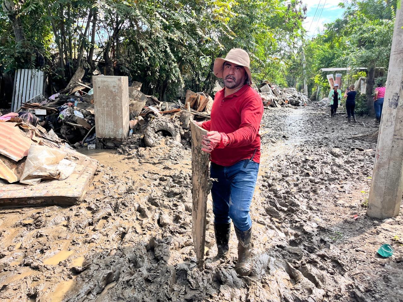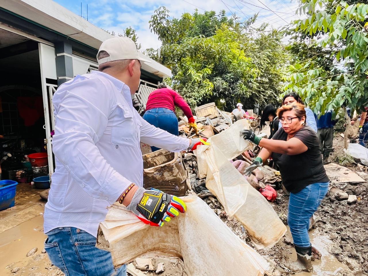 La comitiva recorrió las colonias Morelos y Villa Hermosa, donde el agua alcanzó más de tres metros y medio de altura, destruyendo viviendas y pertenencias. Lejos de limitarse a una visita protocolaria, Samuel Acosta y su equipo se unieron personalmente a las tareas de limpieza y remoción de lodo, trabajando hombro a hombro con los vecinos que hoy luchan por recuperar su patrimonio.