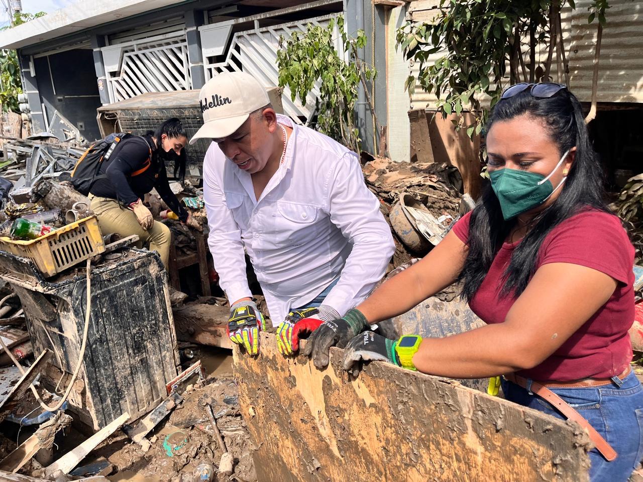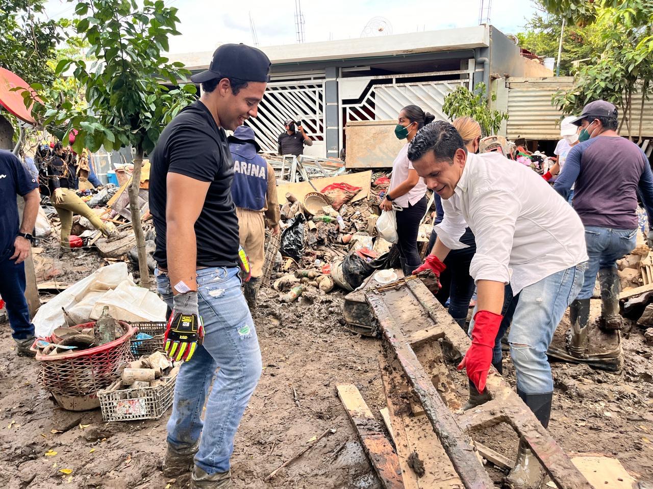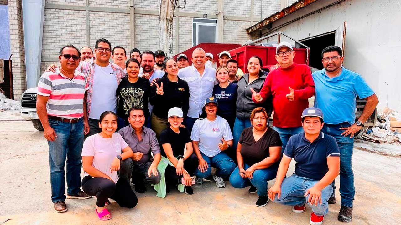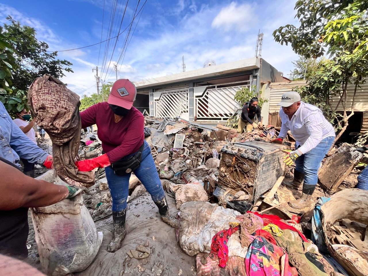 La comitiva recorrió las colonias Morelos y Villa Hermosa, donde el agua alcanzó más de tres metros y medio de altura, destruyendo viviendas y pertenencias. Lejos de limitarse a una visita protocolaria, Samuel Acosta y su equipo se unieron personalmente a las tareas de limpieza y remoción de lodo, trabajando hombro a hombro con los vecinos que hoy luchan por recuperar su patrimonio.
