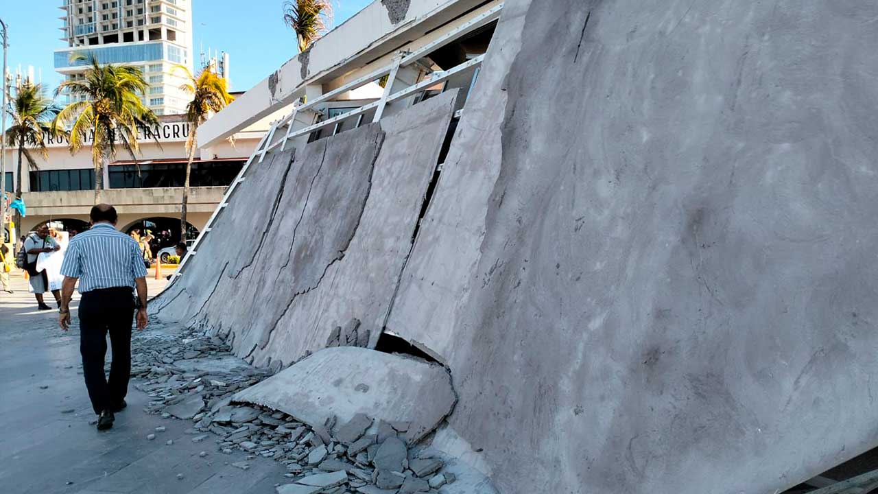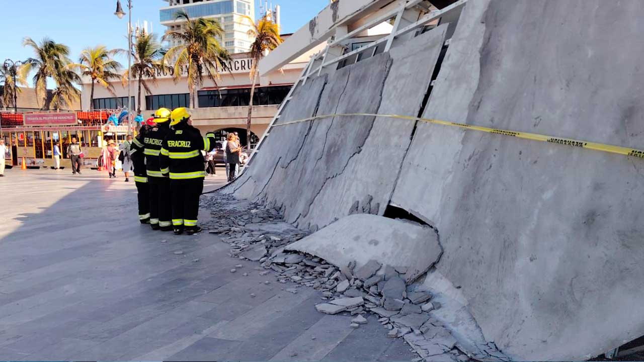 Protección Civil municipal de Veracruz acordonó la zona de derrumbe en Plaza del Heroísmo Veracruzano, “Para salvaguardar la integridad de la población y de turistas”.
