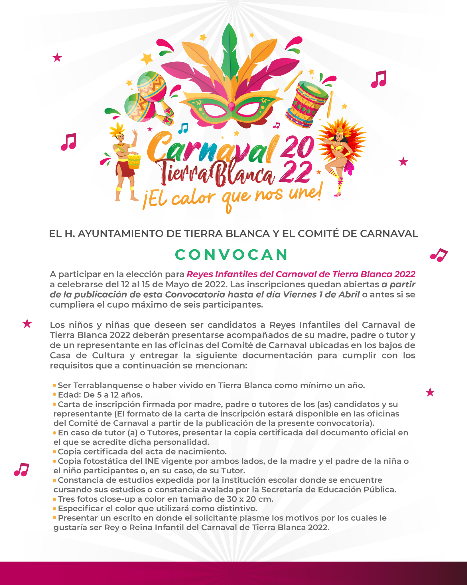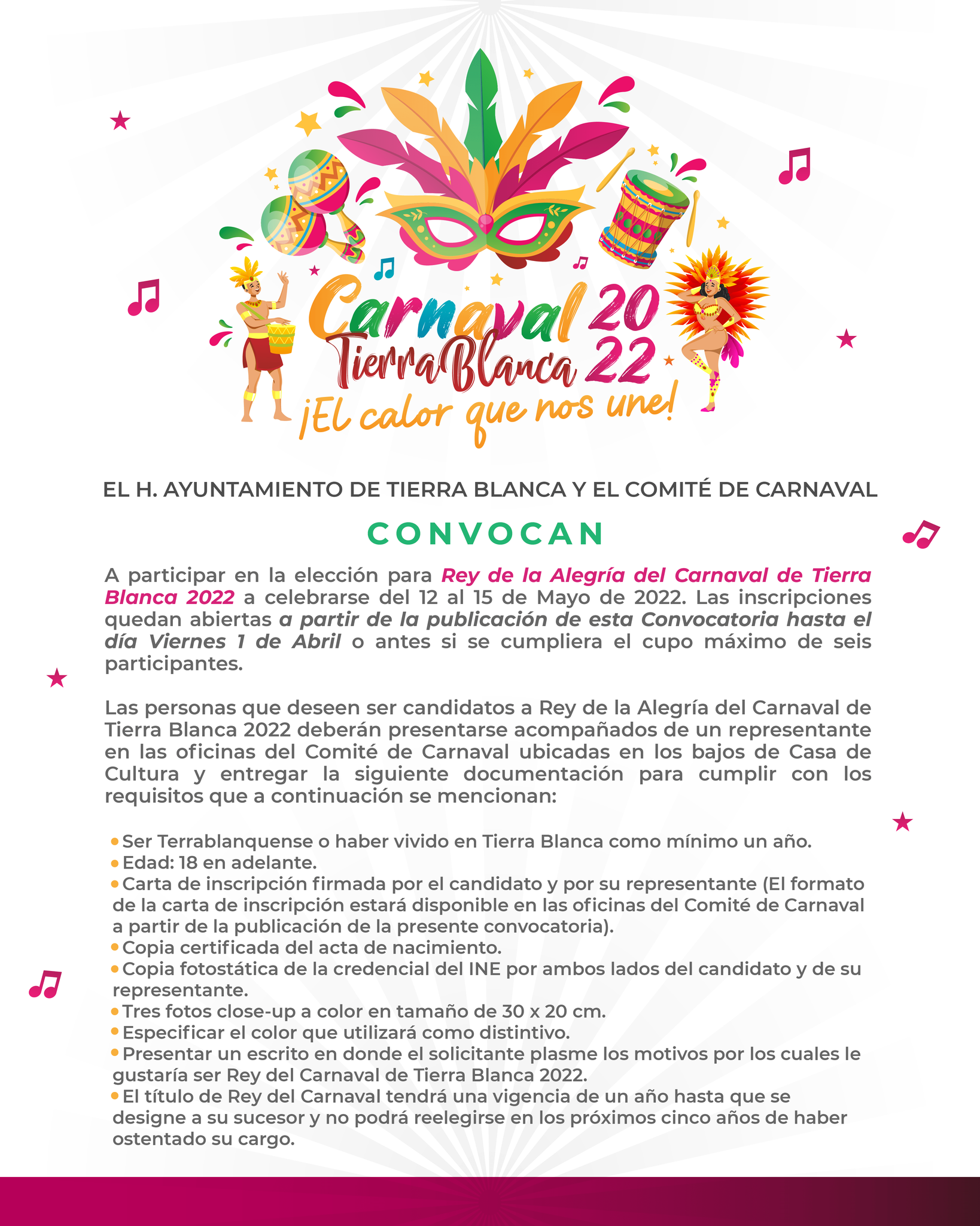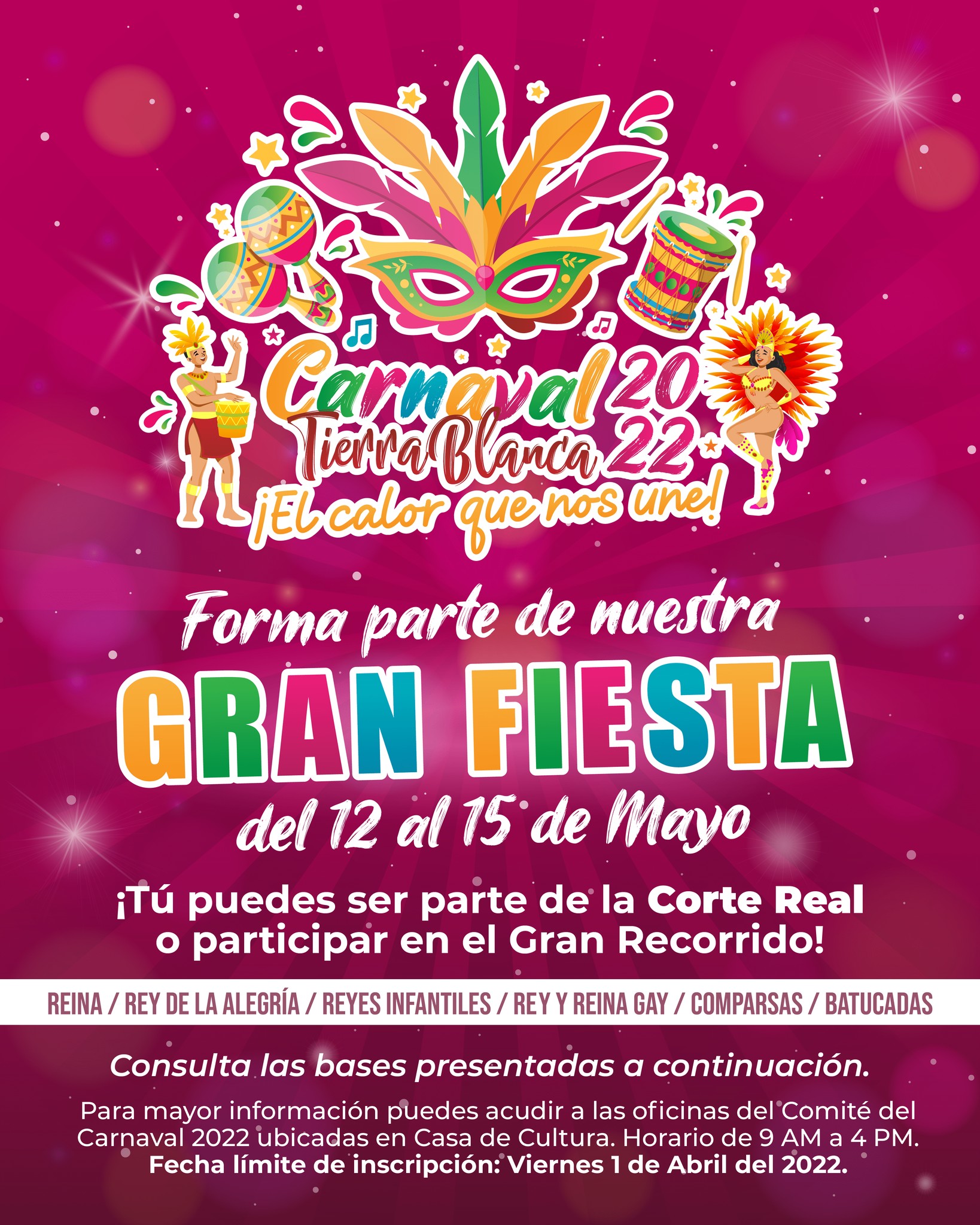 Consulta las bases presentadas a continuación y ve a inscribirte a las Oficinas del Comité del Carnaval de Tierra Blanca 2022 ubicadas en Casa de Cultura en un horario de