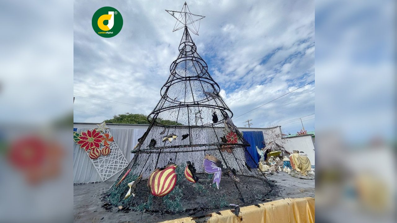Automovilistas y transeúntes se percataron de los severos daños que sufrió el pino navideño monumental, ubicado en el primer cuadro de la cabecera municipal, el cual apareció completamente calcinado.